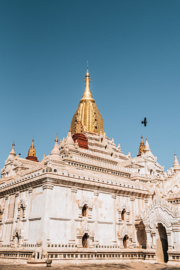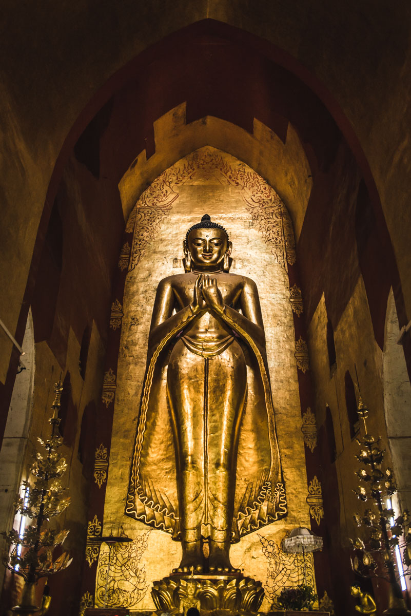 Schon von außen sticht der weiße Tempel mit der goldenen Stupa aus der Menge an Tempeln ziemlich heraus. Kein anderer Tempel in Bagan ähnelt dem Ananda-Tempel und das macht ihn total faszinierend und einzigartig. Hinzu kommt, dass der Tempel sehr schön renoviert wurde. Im Inneren des Ananda-Tempels befinden sich – wie in sehr vielen buddhistischen Tempeln in Myanmar – vier riesige, stehende Buddas, die in die vier Himmelsrichtungen blicken.