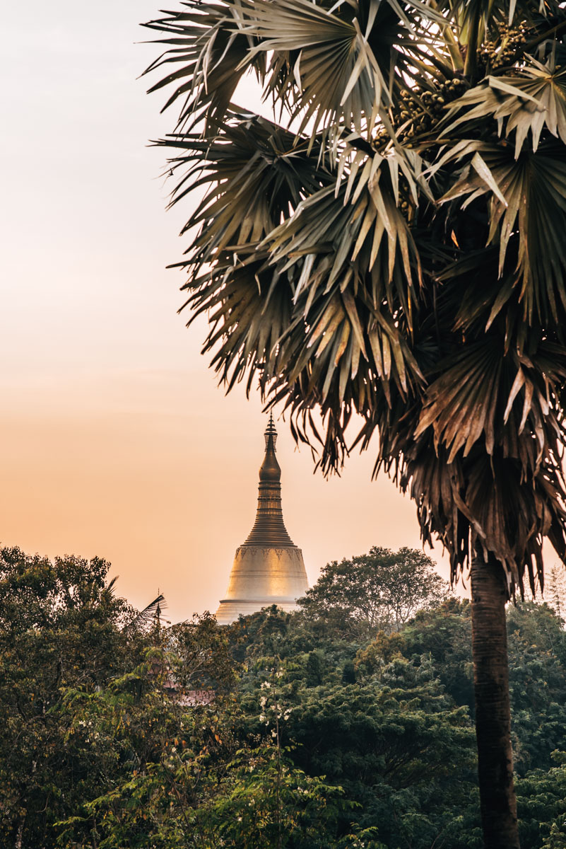 Der letzte Stopp unserer Tempel-Tour war ein Vorschlag unseres Fahrers. Zum Glück haben wir zugestimmt, denn von der Hintha Gon Pagode konnten wir tatsächlich den Sonnenuntergang über der Shwemawdaw Pagode bestaunen. Die Hintha Gon Pagode selbst fanden wir übrigens leider recht ungepflegt und wenig beeindruckend. Das Highlight ist hier definitiv der Ausblick auf Bago – wenngleich die Sicht durch einige Bäume und Häuser ein wenig beeinträchtigt ist.