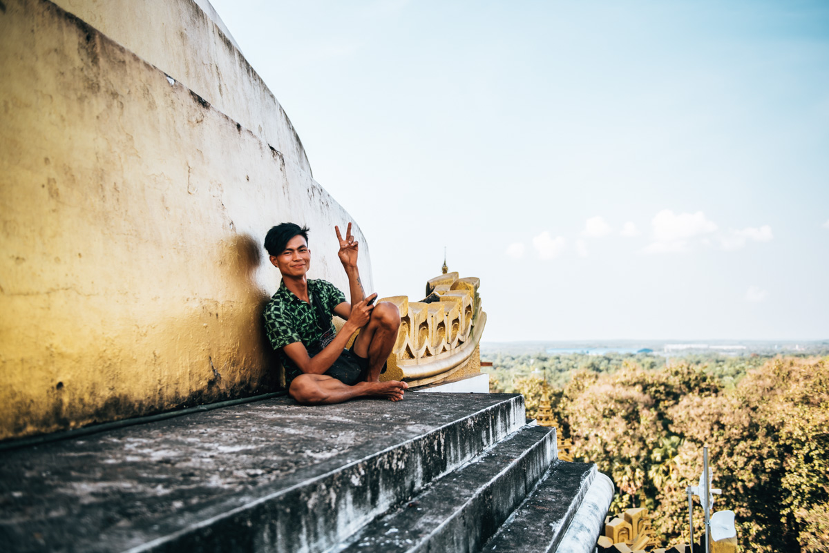 Mit ihrer Kombination aus weiß und gold hat uns die Mahazedi Pagode ebenfalls sehr gut gefallen. Schade finden wir allerdings, dass sie nur von Männern bestiegen werden darf. Wie bei sehr vielen Heiligtümern in Myanmar werden Frauen auch hier benachteiligt. Nur Romeo konnte also die steilen Treppen erklimmen und den – sehr imposanten – Fernblick in alle Richtungen genießen.
