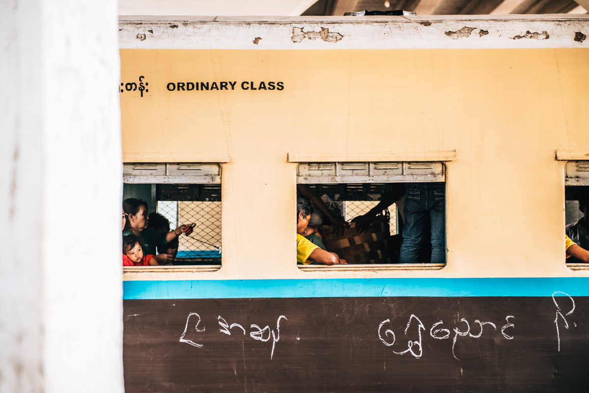 Zugfahren in Myanmar ist ein Erlebnis, das können wir dir schon einmal versprechen. Es rumpelt und ruckelt im Schneckentempo dahin, doch dafür kannst du die Landschaft wunderbar an dir vorbeiziehen sehen und das Leben der Einheimischen im und außerhalb des Zuges ein bisschen beobachten.