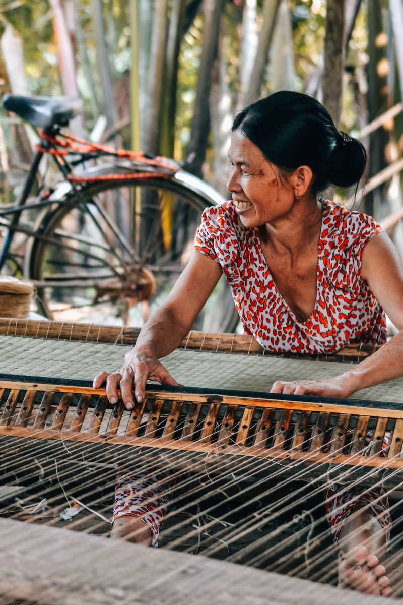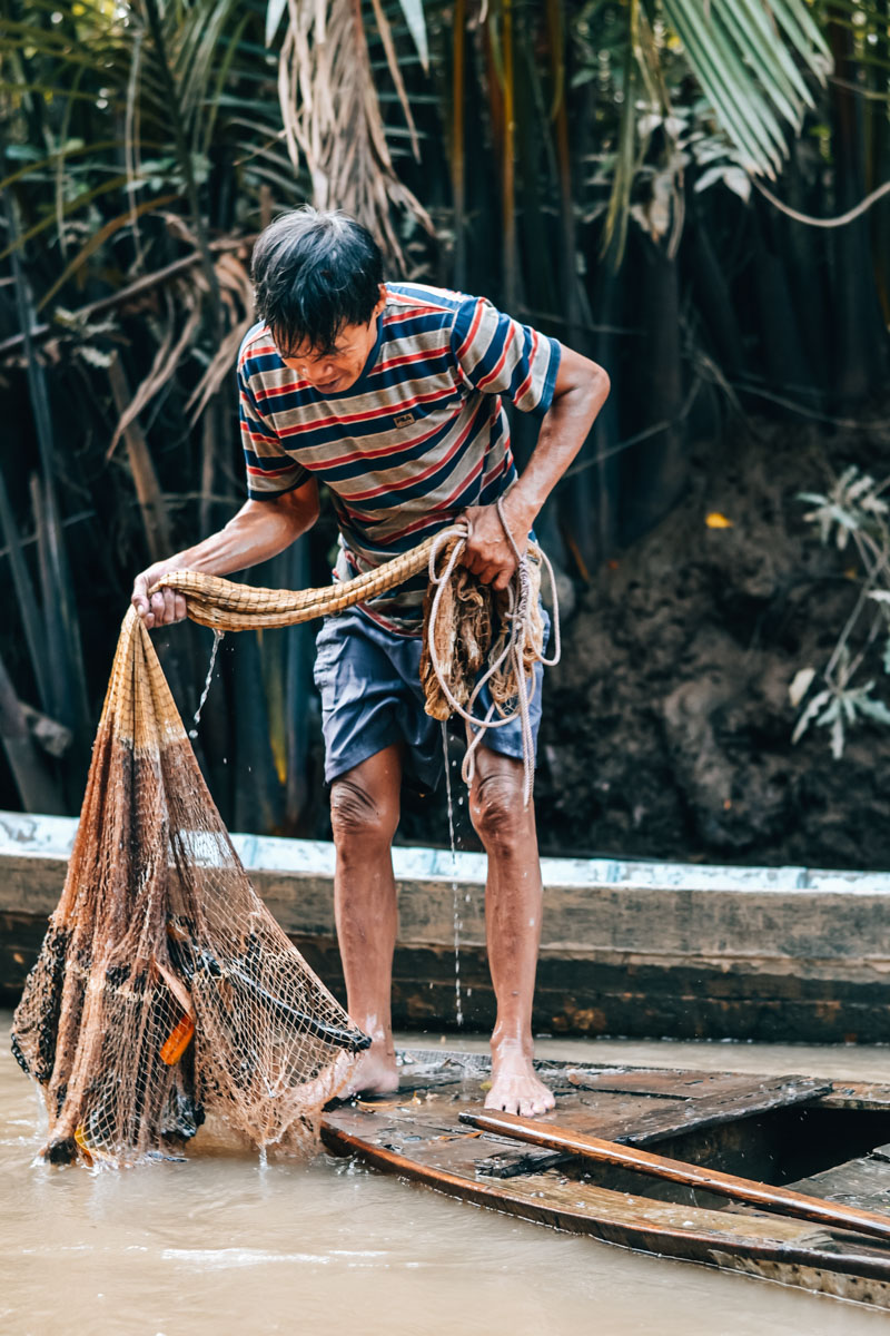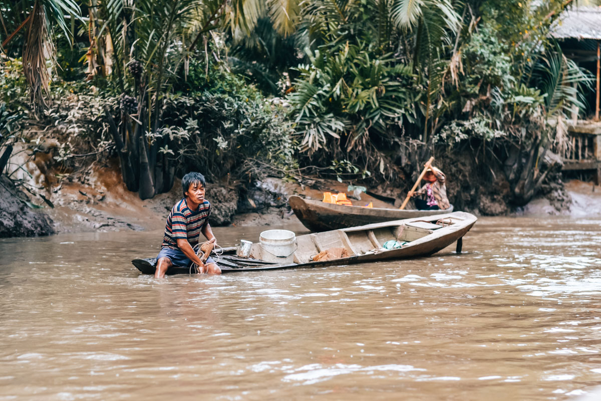 Die meisten (so auch wir) erkunden die Region auf dieselbe Art und Weise wie sich auch die Einheimischen größtenteils fortbewegen: Mit dem Boot. Du fährst an den Häusern am Fluss vorbei, wirfst einen Blick in die Hinterhöfe, beobachtest die Menschen bei ihrer Arbeit und erkennst einmal mehr, warum der Mekong die Lebensader Südostasiens genannt wird. Der Mekong und seine Flussarme bzw. Kanäle bestimmen schlichtweg den gesamten Alltag der Bevölkerung.