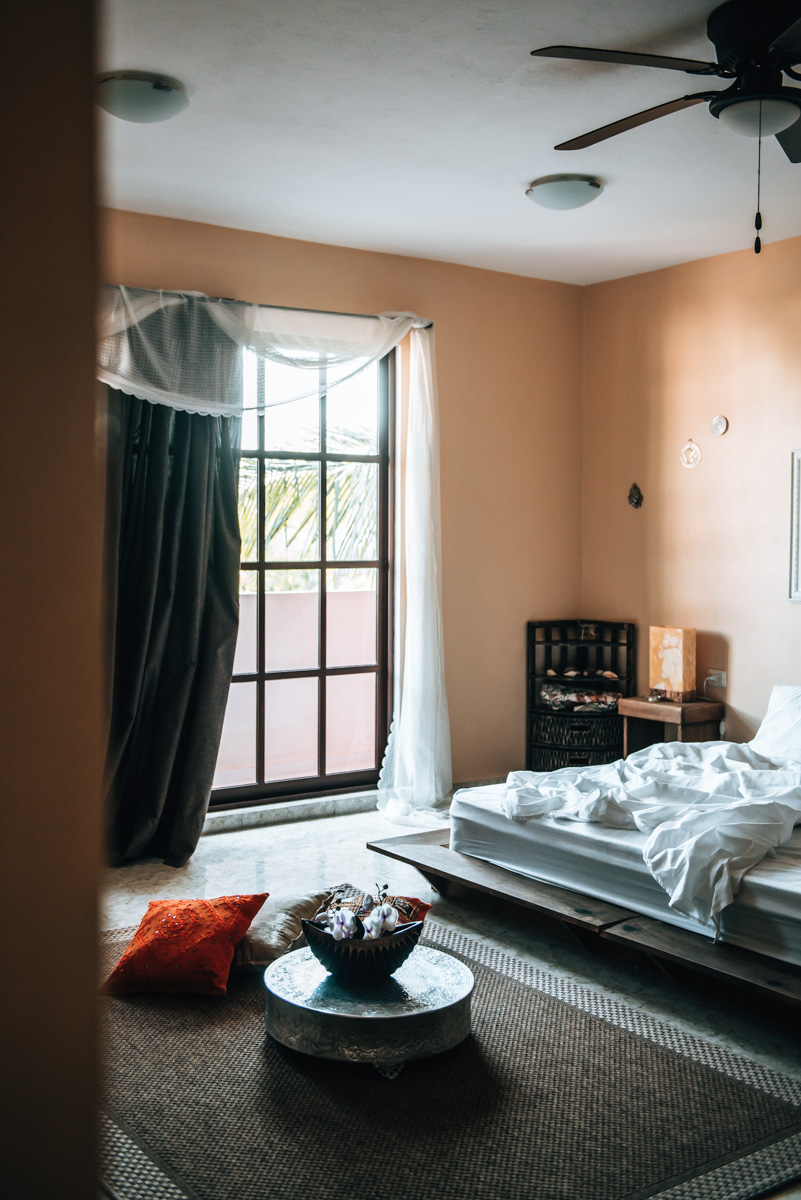 Unser Zimmer (Deluxe mit Kingsize Bed) lag im ersten Stock und war riesig. Die Einrichtung ist sehr geschmackvoll: ein bisschen mexikanisch, ein bisschen orientalisch und vor allem mit sehr viel Liebe fürs Detail! In dem sehr breiten Bett haben wir richtig gut geschlafen. Bezahlt haben wir etwa 90 Euro für zwei Nächte. Es gibt auch günstigere Zimmer im Erdgeschoß.