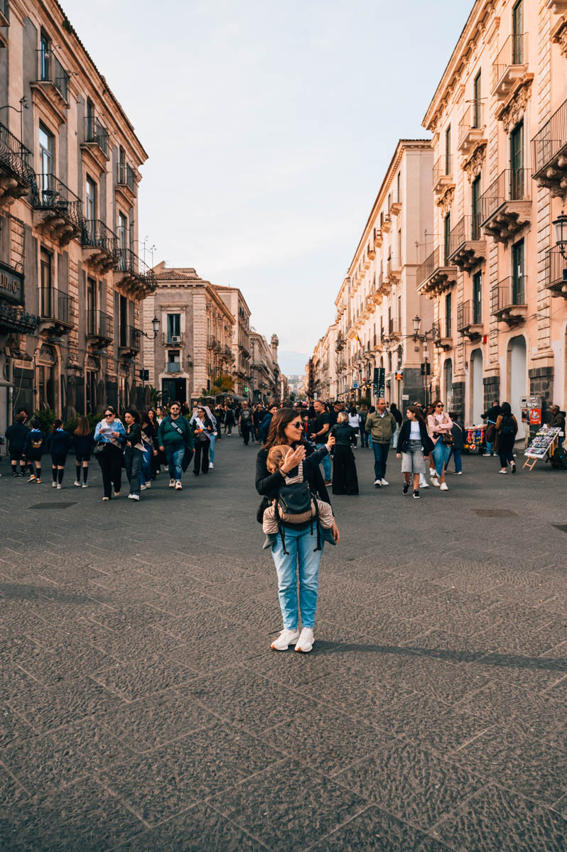Die belebteste Straße im Zentrum von Catania trägt den klingenden Namen „Via Etnea“. Sie ist sozusagen die Lebensader der Stadt. Ihr Name lässt es bereits vermuten: Sie verläuft Richtung Ätna und du kannst diesen an klaren Tagen von der Straße aus auch am Ende der Häuserschlucht sehen.