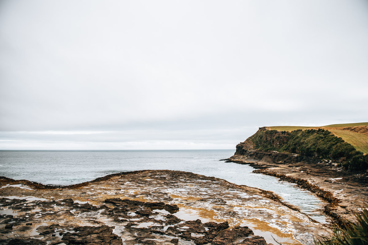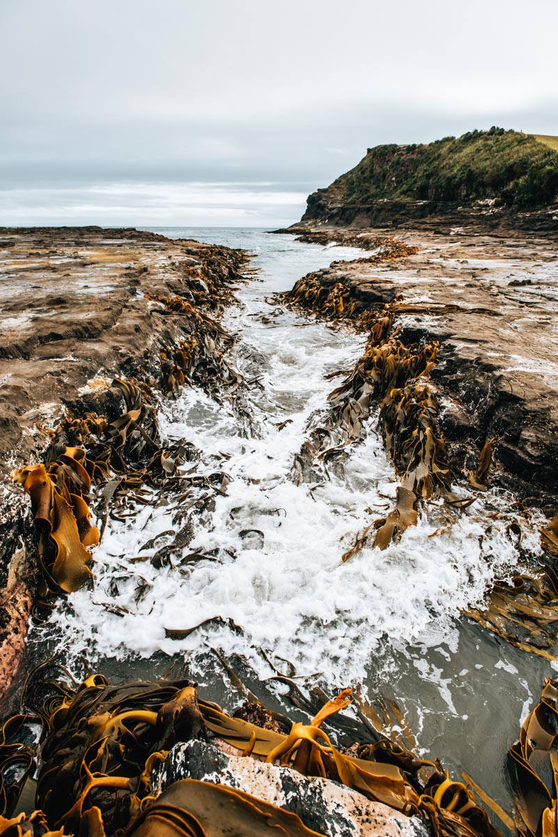 Ziemich weit im Süden der Catlins liegt Curio Bay. Berühmt ist diese Bucht für ihren versteinerten Wald aus der Jurazeit. Bei Ebbe kannst du ihn bestaunen. Auf den ersten Blick hält man die fossilen Baumstämme für ganz normale Felsen, doch bei näherer Betrachtung erkennt man die Maserung des versteinerten Holzes.
