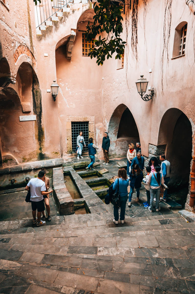 Im Herzen der Altstadt befindet sich der Lavatoio Medievale, ein mittelalterlicher Waschplatz. Du erreichst den Ort, indem du von der Via Vittorio Emanuele abzweigst. Durch ein schmiedeeisernes Tor steigst du über eine breite Treppe hinab zum Waschplatz.