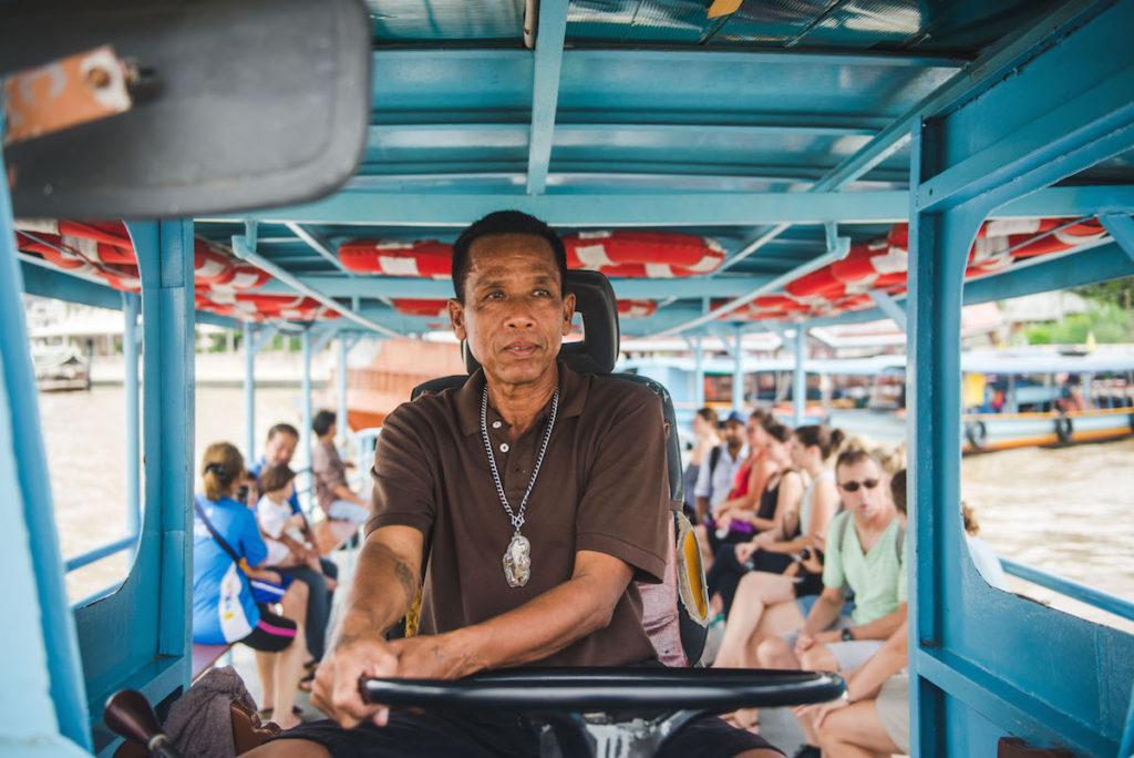 Dieser nette Herr ist Kapitän einer der dutzenden Fähren, die den Chao Phraya River in Bangkok queren. So schnell konnten wir gar nicht schauen, war das Boot von einem Ufer schon auf der gegenüberliegenden Seite angelangt.