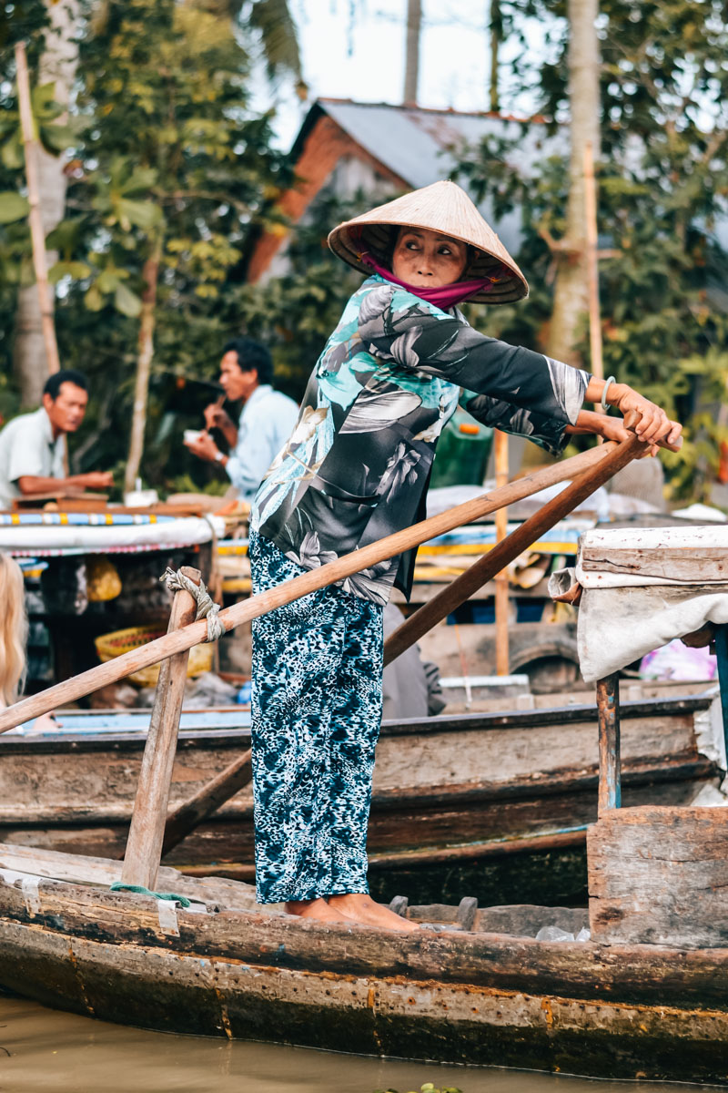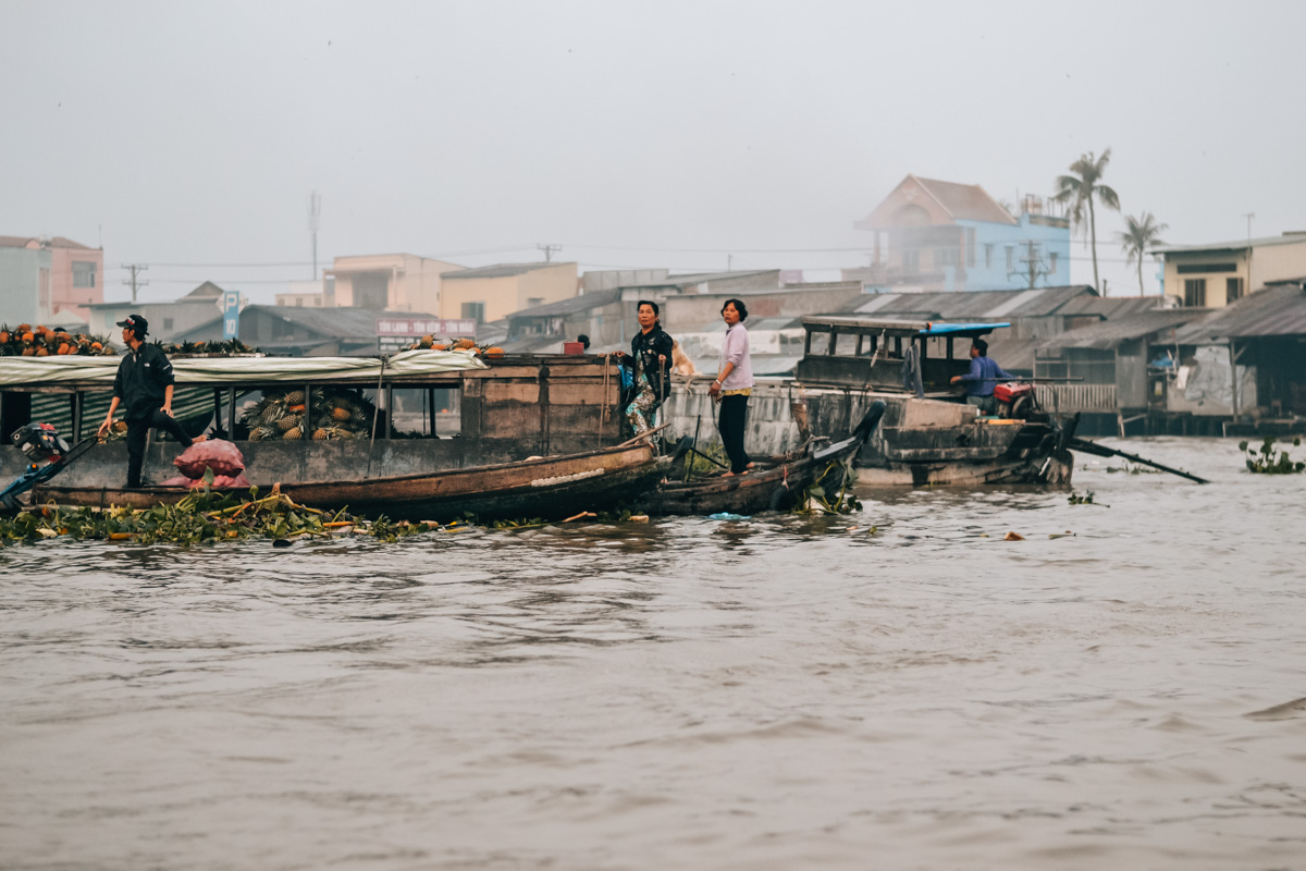 Anders als beim Markt von Cai Rang, finden sich hier ausschließlich kleine Boote zusammen. Dadurch ist man noch näher am Geschehen dran: Wir kollidierten ständig mit anderen Booten und viele Menschen benutzten unser Boot als Weg, um zu einem anderen zu gelangen.