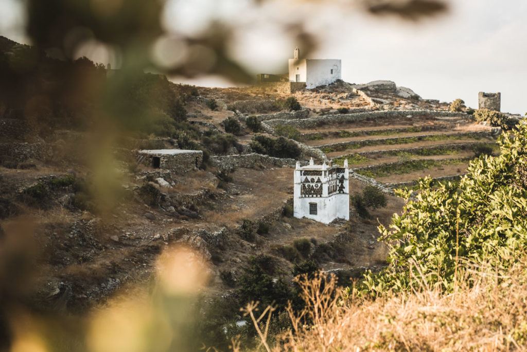 Tinos is known for its pigeon towers which remained from Venetian times. You will find these very typical houses scattered throughout the island, but mostly around the village of Tarambados. If you park your car in Tarambados, after a short (signposted) walk you will come to a small observation deck, from where you have a great view of the famous pigeon houses.