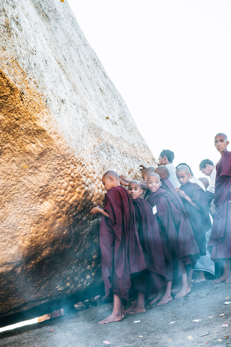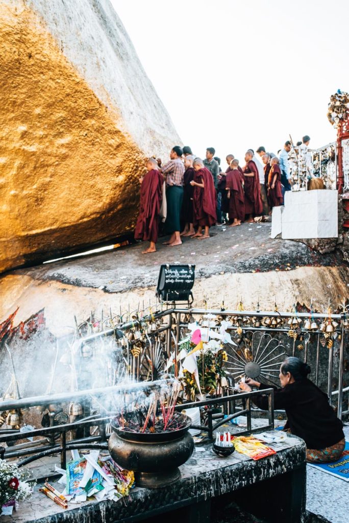 The Golden rock itself, like all important Buddhist sites in Myanmar, are, unfortunately, only allow to be touched by men. Women are only allowed as far as the gate, from there they can only watch, as theprivileged gender exclusively add one golden leaf after another, to the mighty Golden Rock. Naturally, it was very frustrating but we had toaccept it. We found our consolation when the sunset bathed the Golden Rock in it’s glory and presented us with a view far more beautiful at adistance.
