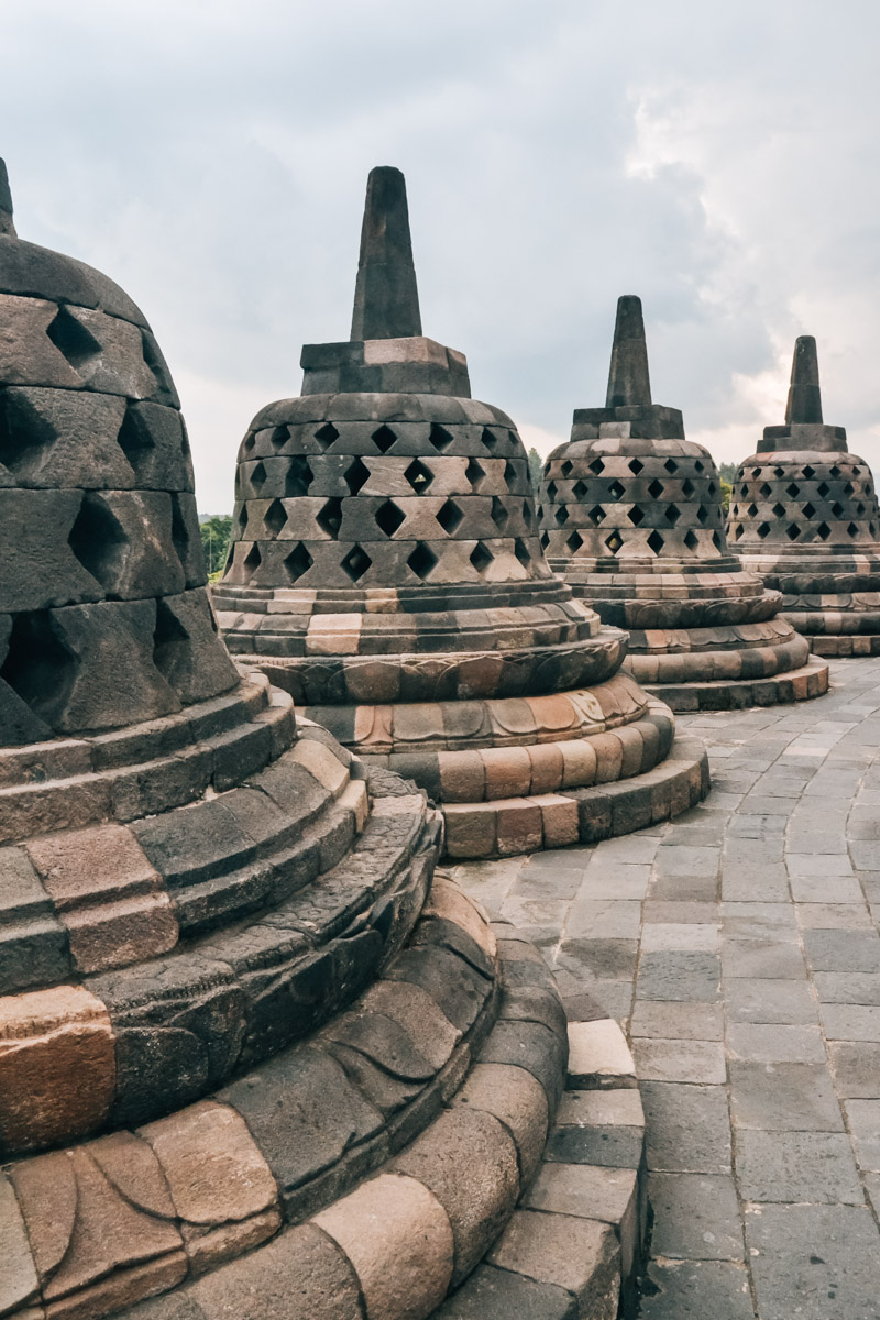 Borobudur Temple is a staggered pyramid with countless characteristic bell-shaped stupas. It is nestled in the midst of lush green hills. The landscape is quite magical. You can climb up the temple: There are a total of nine levels.