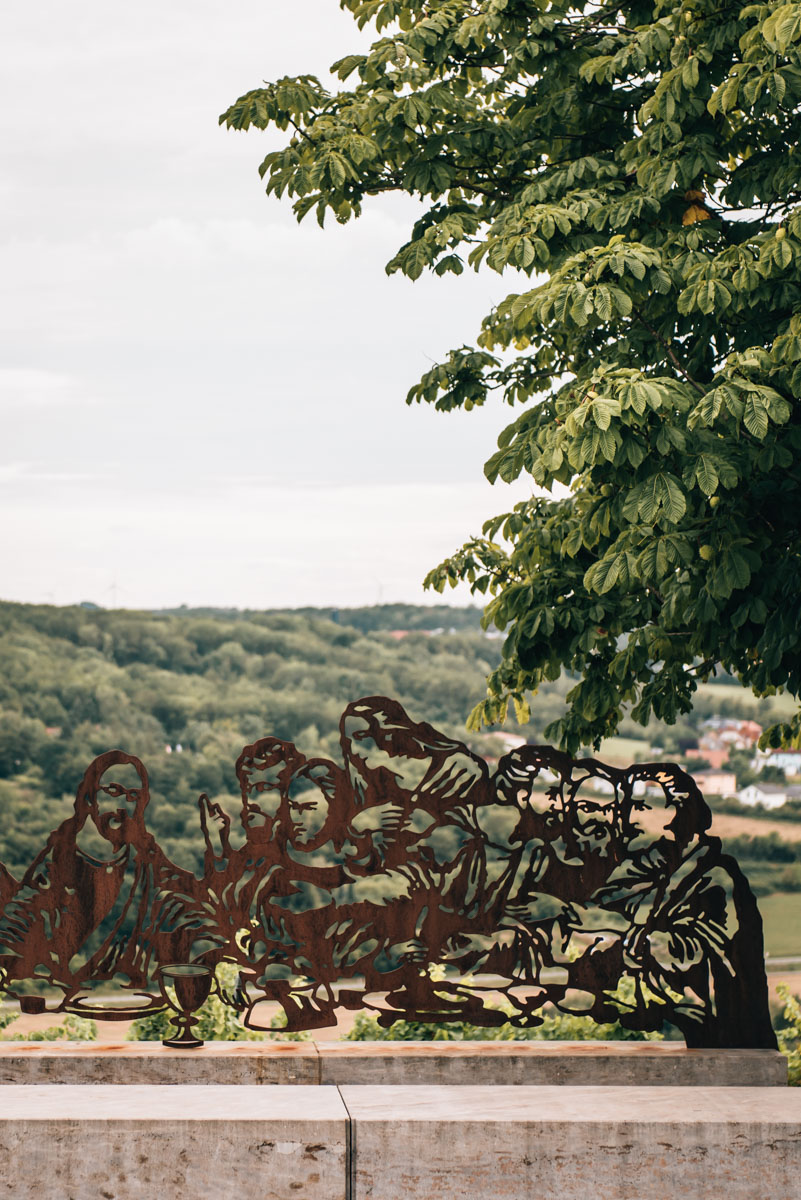 Einmal am Aussichtspunkt angekommen, wirst du gleich sehen, dass sich die Mühe wirklich lohnt: Der Ausblick von hier oben auf Frickenhausen ist nämlich einfach wunderschön. Das Thema dieses terroir-f-Punkts lautet übrigens „Wein & Bibel“. Daher begegnet dir hier die berühmte Abendmahlszene von Leonardo da Vinci in Form einer flachen Skulptur aus Stahl.