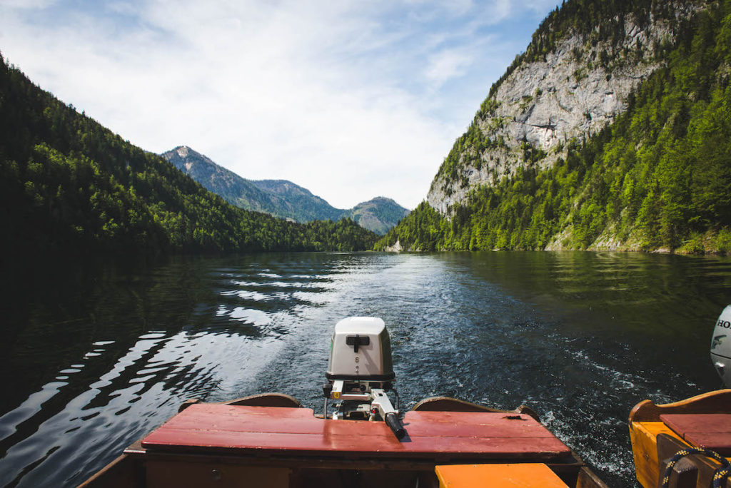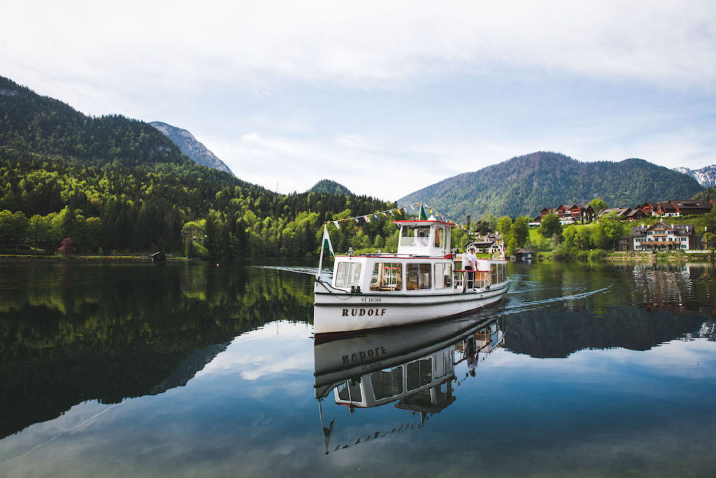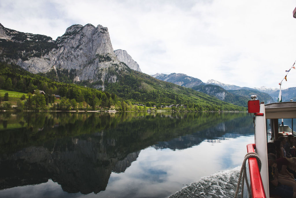 Zunächst geht es mit dem Schiff einmal quer über den Grundlsee. Warum kitschig, fragst du dich? Die Berggipfel spiegeln sich im glitzernden Wasser. Die Sonnenstrahlen kämpfen sich ganz langsam durch die Nebeldecke und das Schiff könnte einem Heimatfilm entsprungen sein. Müssen wir mehr sagen?