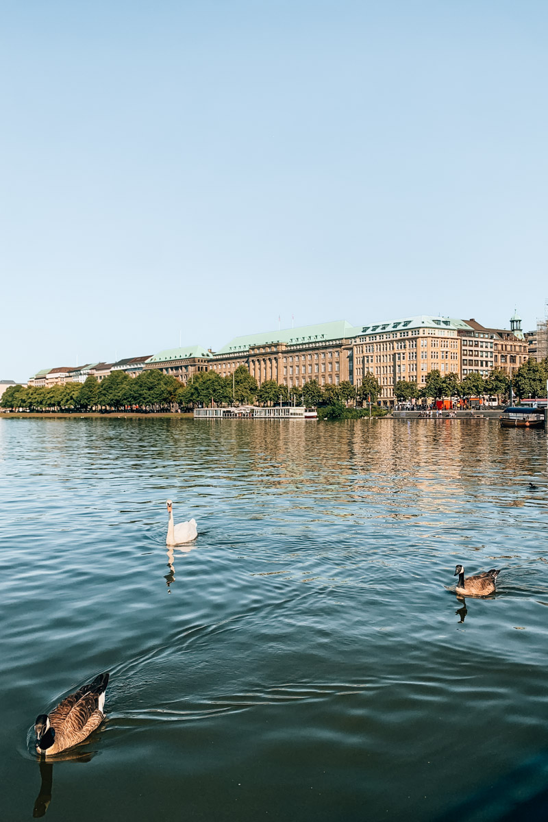 Wenn du zum ersten Mal in Hamburg bist, dann ist die Gegend rund um den Jungfernstieg ein guter Startpunkt für einen Rundgang. Du landest hier direkt an der Binnenalster – einem künstlichen See, der von der Alster (einem Fluss) gespeist wird. Entlang des Ufers der Binnenalster sind teils prunkvolle Gebäude angesiedelt.