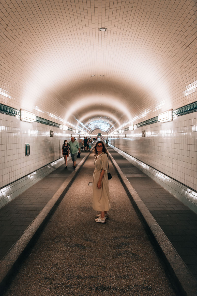 Der Alte Elbtunnel ist exakt 426,5 Meter lang und kann sowohl zu Fuß als auch mit dem Fahrrad (allerdings nicht mehr mit dem Auto) kostenlos benutzt werden. Aufzüge bringen dich ganz gemütlich in die Tiefe. Hier unten hat es lauschige 15 bis 16 Grad – eine angenehme Abkühlung im Sommer.