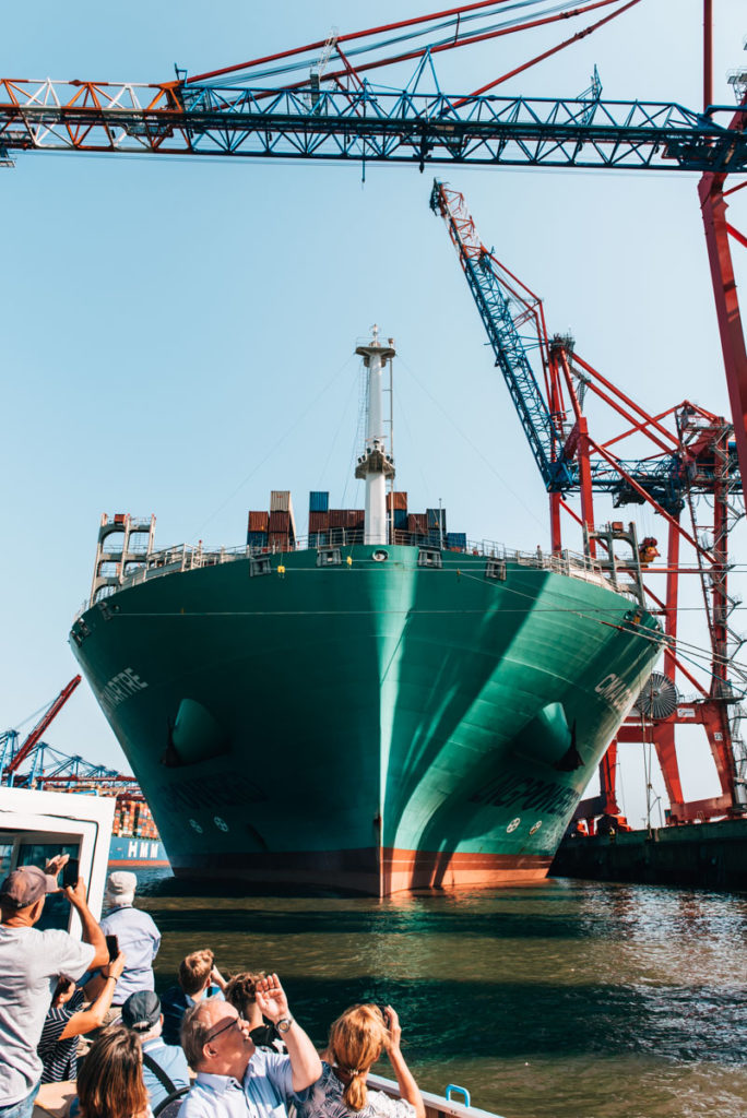 Der Klassiker ist die sogenannte „Große Hafenrundfahrt“. Diese dauert zwei Stunden. Wie es der Name schon verrät, drehst du hier eine große Runde durch den Hamburger Hafen und kommst beispielsweise den gigantischen Container-Schiffen sehr nahe.