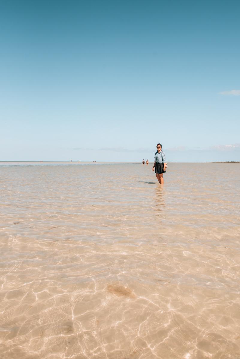 Unser erster Stopp führte uns nach Osten zum Punta Mosquito. Bei Ebbe erreichst du den Strand über eine lange Sandbank. Dein Fahrrad parkst du einfach am Ende des Weges. Stell dich auf einen etwa 1-stündigen Spaziergang ein. (Achtung: Ab dem frühen Nachmittag wird der Wasserpegel höher und du kannst dann eventuell nicht mehr auf der Sandbank gehen, sondern musst eine kleine Lagune queren, in der Krokodile leben.)