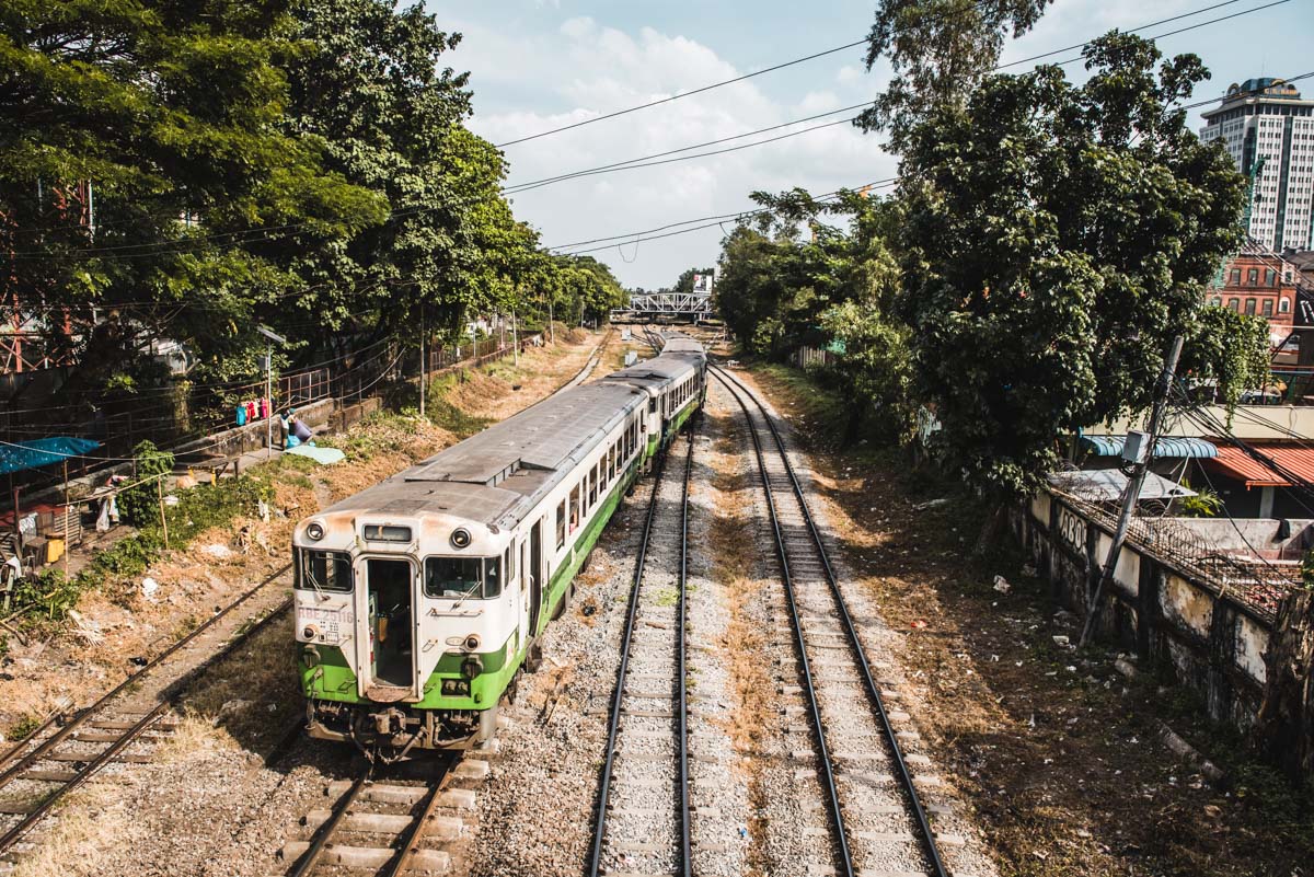 Zugfahren in Myanmar ist ein holpriges Unterfangen, denn die Schienen sind teilweise abenteuerlich. Wir haben bisher zwei Zugfahrten unternommen: Von Yangon nach Bago sowie von Yangon mit der Circle Line.
