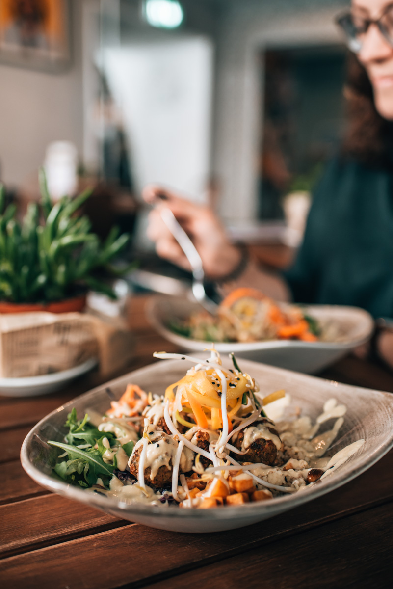 Du kannst zwischen verschiedenen Frühstücksgerichten (Avocado Toast, Smoothie Bowl etc.) bzw. Lunch-Bowls wählen. Zu Mittag gibt es auch immer ein wechselndes Mittagsgericht. Es werden viele vegetarische Gerichte angeboten, aber auch einige Optionen mit Fleisch sind dabei. Die Preise sind in Anbetracht der Qualität absolut in Ordnung – die Lunch-Bowls kosten etwa knapp 10 Euro.