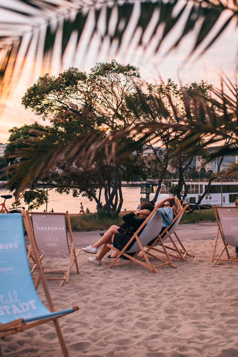 Die Sandburg befindet sich am Donauufer (oder besser gesagt ganz in der Nähe davon – eine Wiese trennt dich nämlich vom Wasser). Du kannst es dir in einem der Liegestühle gemütlich machen und die Zehnen in den Sand stecken. Urlaubsgefühl mitten in der Stadt!