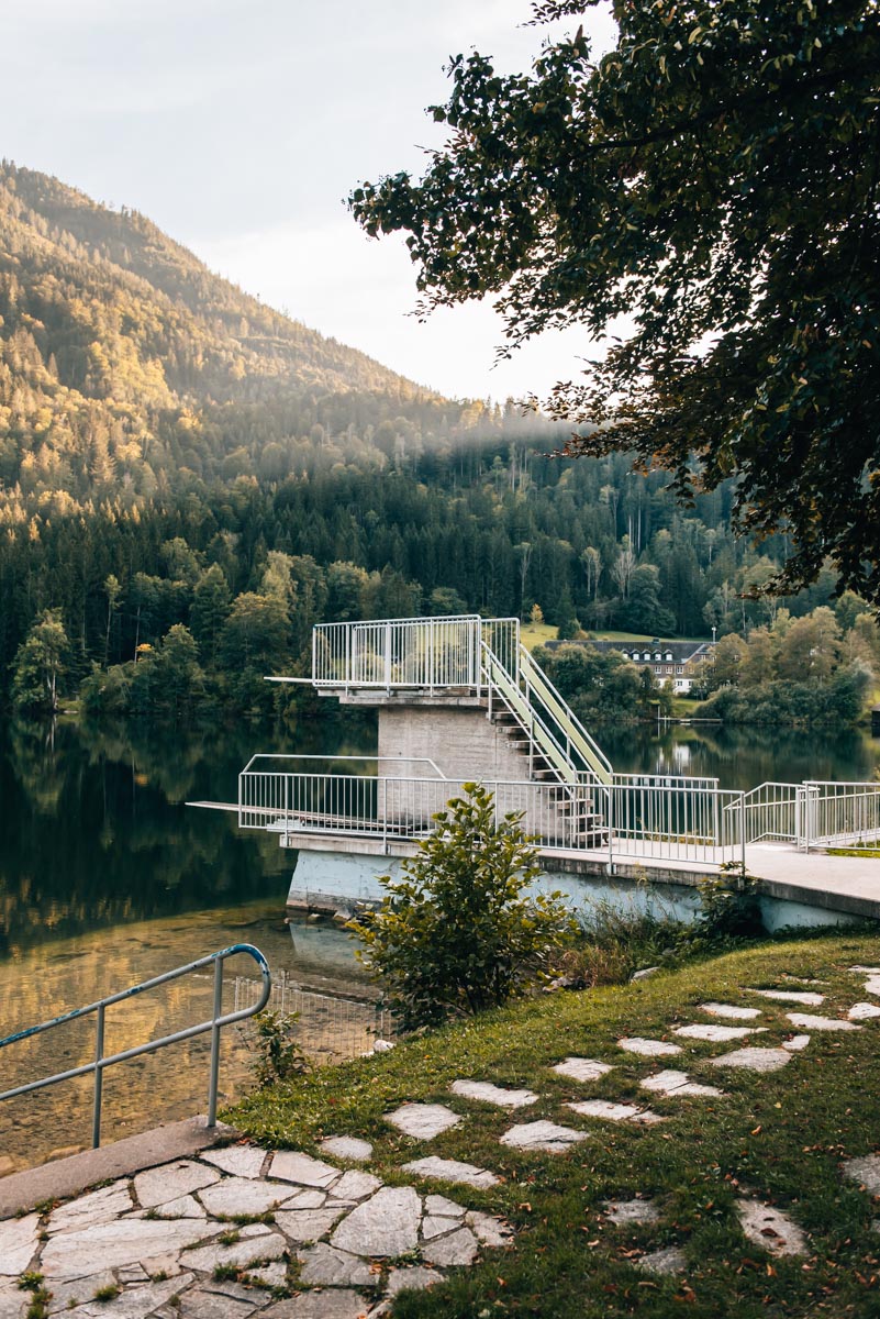 Wer ganz bequem ins Wasser gehen möchte, der ist im Seebad Lunz am See am besten aufgehoben. Hier findest du eine große Liegewiese mit schattenspendenden Bäumen, einen Sprungturm und einen Kiosk mit warmen Kleinigkeiten zu essen. Und nicht zu vergessen: Eine ordentliche Portion Retro-Flair wie es sich für Lunz am See gehört.