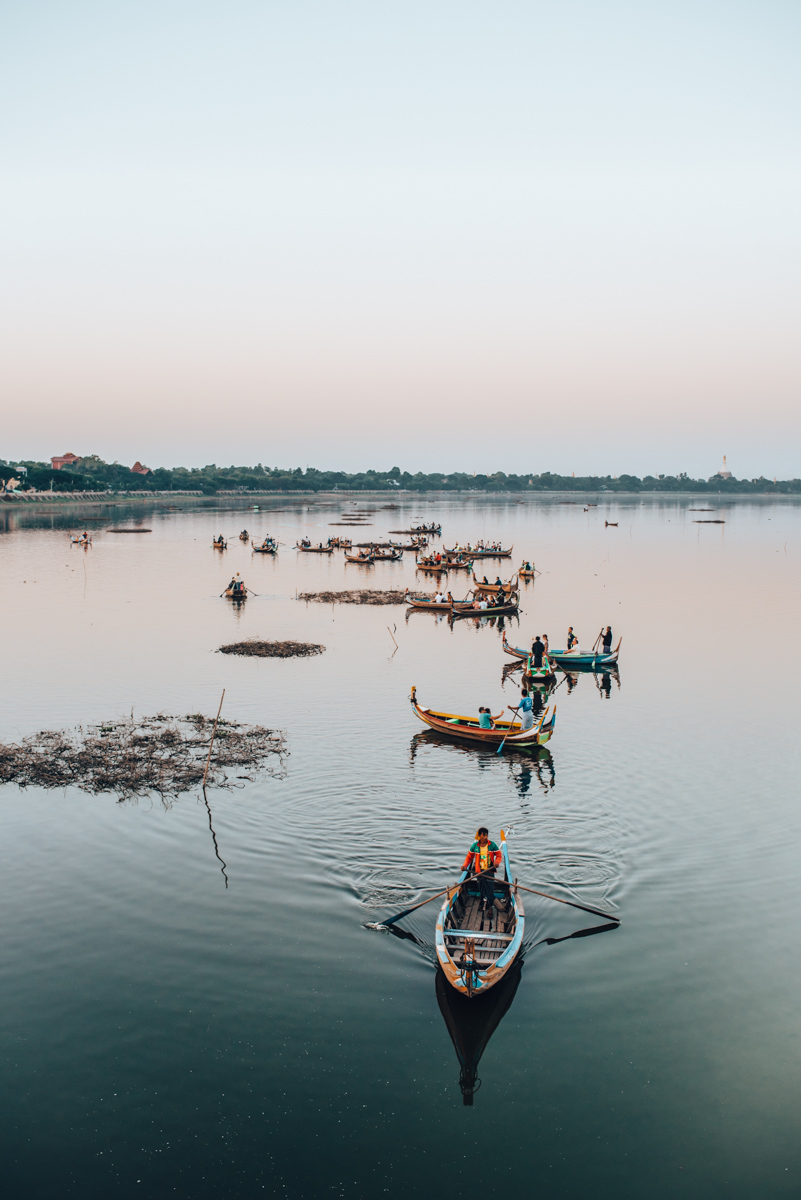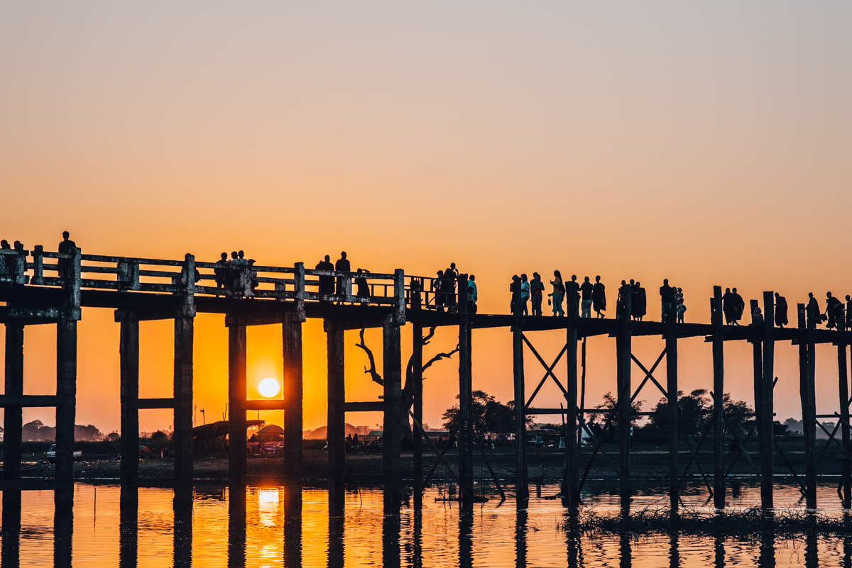 Das letzte Ziel unseres Tagesausflugs war die berühmte U-Bein-Brücke in Amarapura. Die längste und älteste Teakholzbrücke der Welt quert auf einer Länge von 1,2 Kilometern den Taungthaman-See. Ja, zum Sonnenuntergang ist die Brücke hoffnungslos überlaufen. Kein Wunder, schließlich möchte jeder das berühmte Fotomotiv von der Brücke samt der untergehenden Sonne selbst schießen. Eine Alternative, den Massen zu entgehen, ist der Sonnenaufgang.