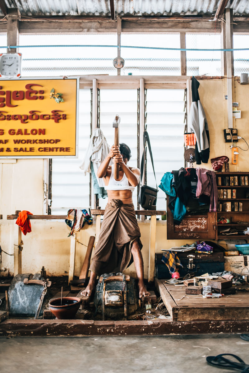 Was wir zunächst gar nicht wussten: In Myanmar wird Gold immer noch per Hand geschlägert. Den Goldschlägern kann man in Mandalay buchstäblich über die Schulter blicken. Mit einem etwa drei Kilogramm schweren Hammer schlagen sie stundenlang, immer und immer wieder zielsicher auf das goldene Päckchen ein.