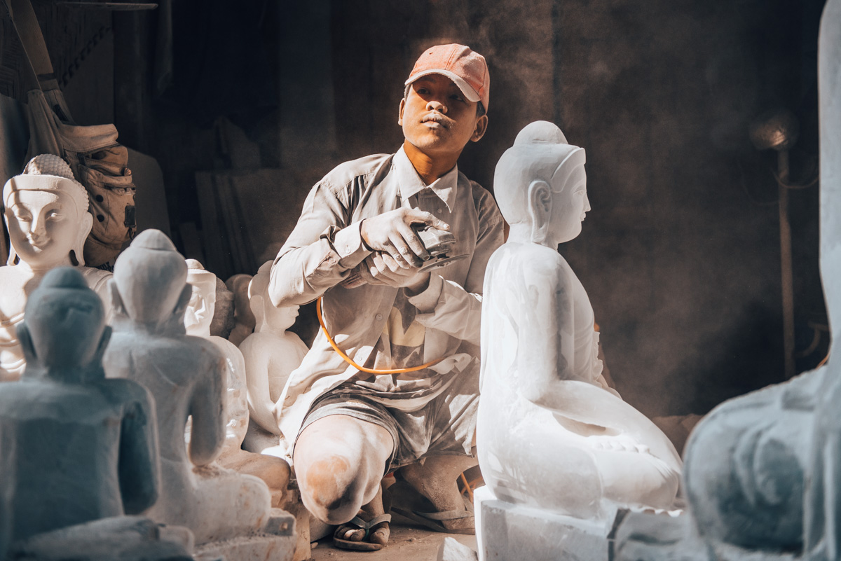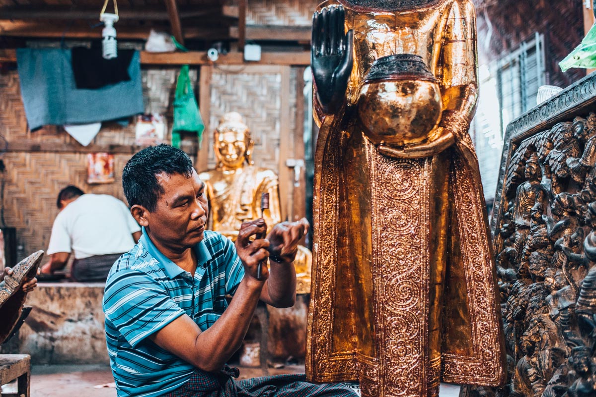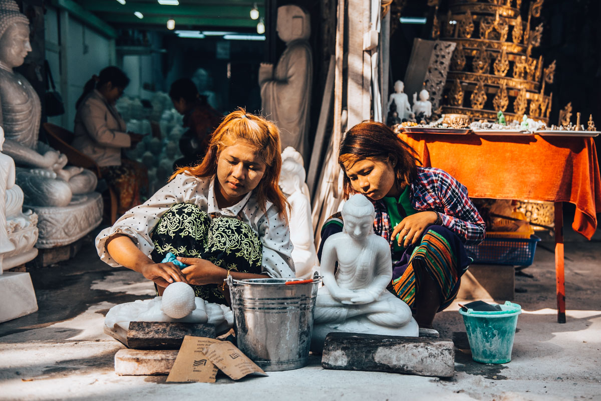 Nur einige Hundert Meter südlich der Mahamuni-Pagode gelangst du zunächst ins Viertel der Steinmetze und anschließend in jenes der Holzschnitzer. Hier reiht sich eine Werkstatt an die andere. Die Arbeitsbedingungen der Menschen zu sehen, ist erschreckend: Viele schleifen hier ganz ohne Schutzmaske und sind von Kopf bis Fuß von weißem Staub überzogen. Nach nur wenigen Minuten hatten wir schon mit der Luft zu kämpfen – kaum auszumalen, wie es den Menschen hier nach Monaten oder Jahren gehen muss.