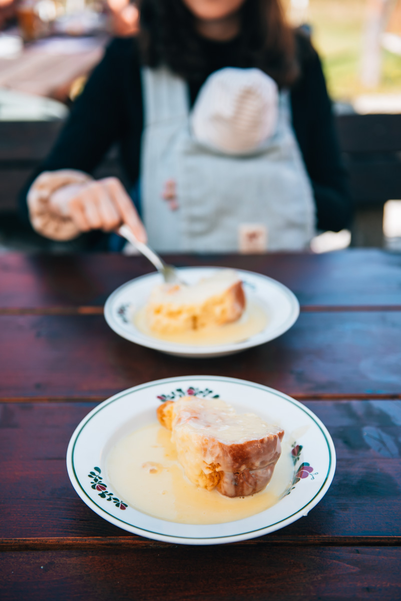 Zwar ist der Rundweg nicht sonderlich schweißtreibend – am Ende bietet sich dennoch eine kleine Belohnung im urigen Gasthaus Wuchtlwirtin an. Wie es der Name schon verrät, werden hier nämlich die berühmten Wuchteln (= Buchteln) gebacken. Du kannst sie entweder pur (nur mit Marillenmarmelade gefüllt) oder in deutlich deftigeren Variationen (z.B. mit Vanillesauce oder mit Schokosauce und Eierlikör) bestellen. Kleiner Tipp: Du kannst eine Portion auch teilen – dann bekommt jede/r einen eigenen Teller. Reichte uns persönlich allemal.
