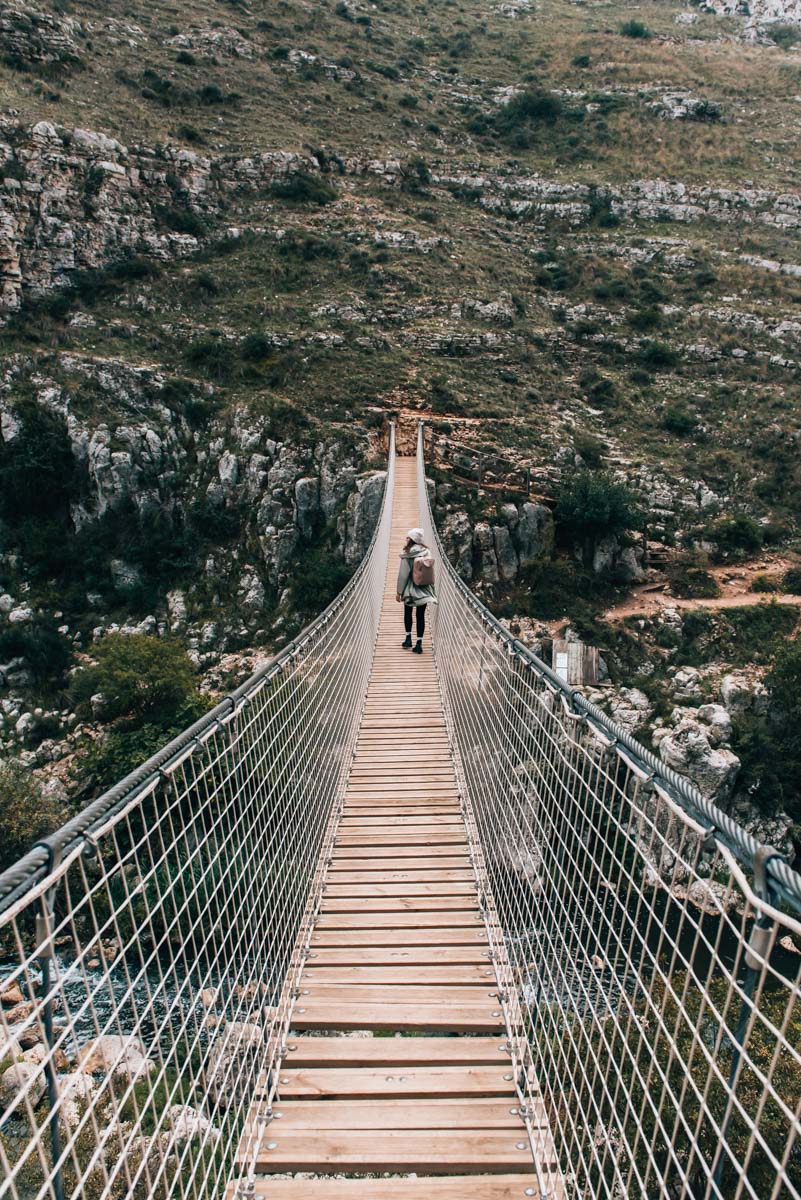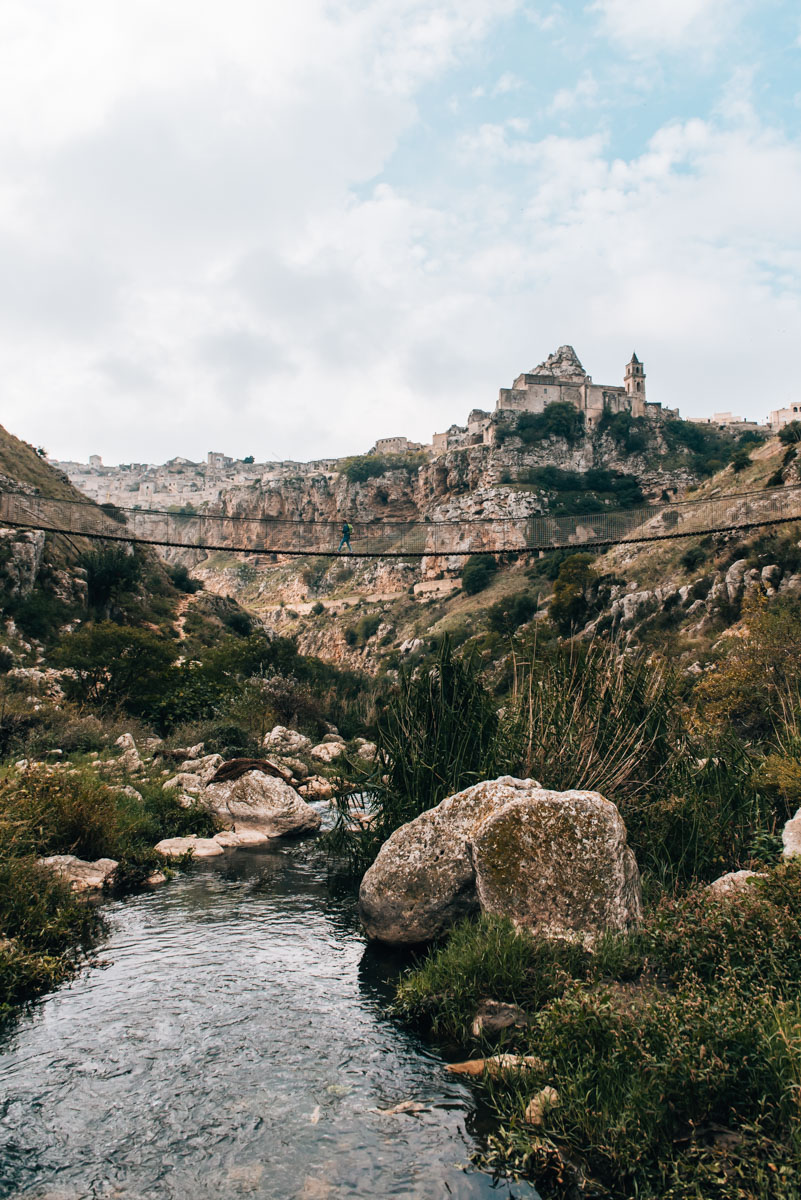 Und noch etwas ist anders: Die Gehzeit. Erreichbar ist dieser Aussichtspunkt nämlich nach einer ca. 40-minütigen Wanderung. Zunächst geht es direkt aus der Altstadt von Matera bergab in die Schlucht zur Ponte Tibetano della Gravina. Nach Überquerung dieser Hängebrücke wanderst du anschließend auf der anderen Seite in Serpentinen in die Höhe zum Aussichtspunkt.