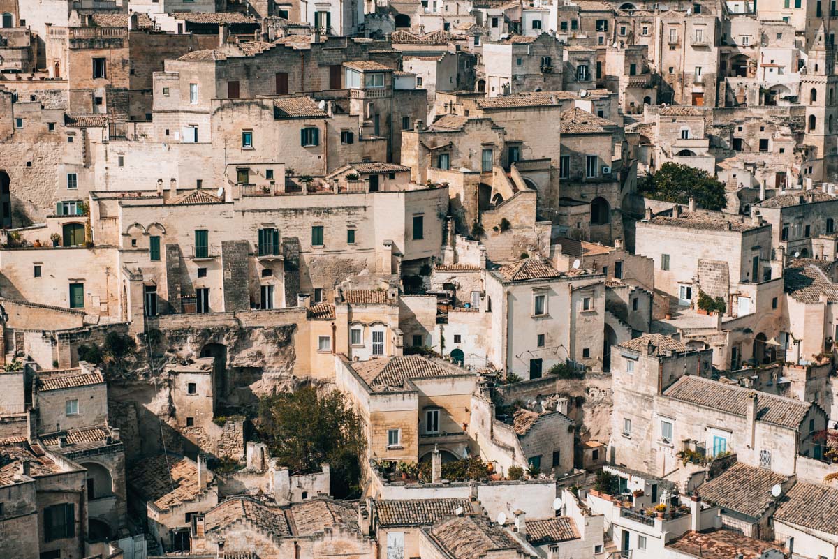 - Materas Altstadt besteht aus Höhlenwohnungen, den sogenannten „Sassi“, die in den Tuffstein gegraben und später mit Fassaden verkleidet wurden.