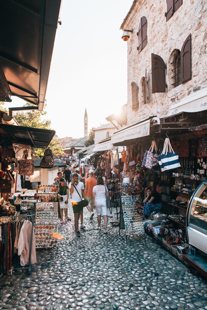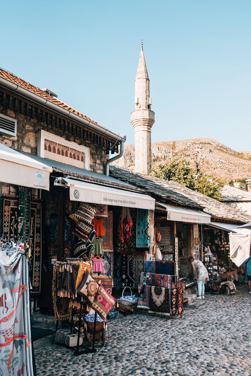 Rund um die Brücke erstreckt sich die kleine, aber feine Altstadt von Mostar. Viel mehr als ein paar kopfsteingepflasterte Gässchen sind es nicht – diese sind dafür aber äußerst sehenswert.