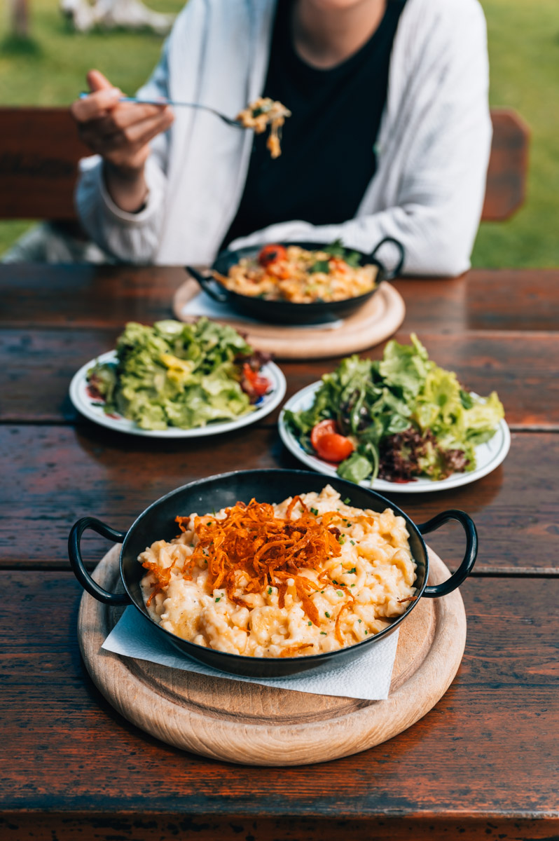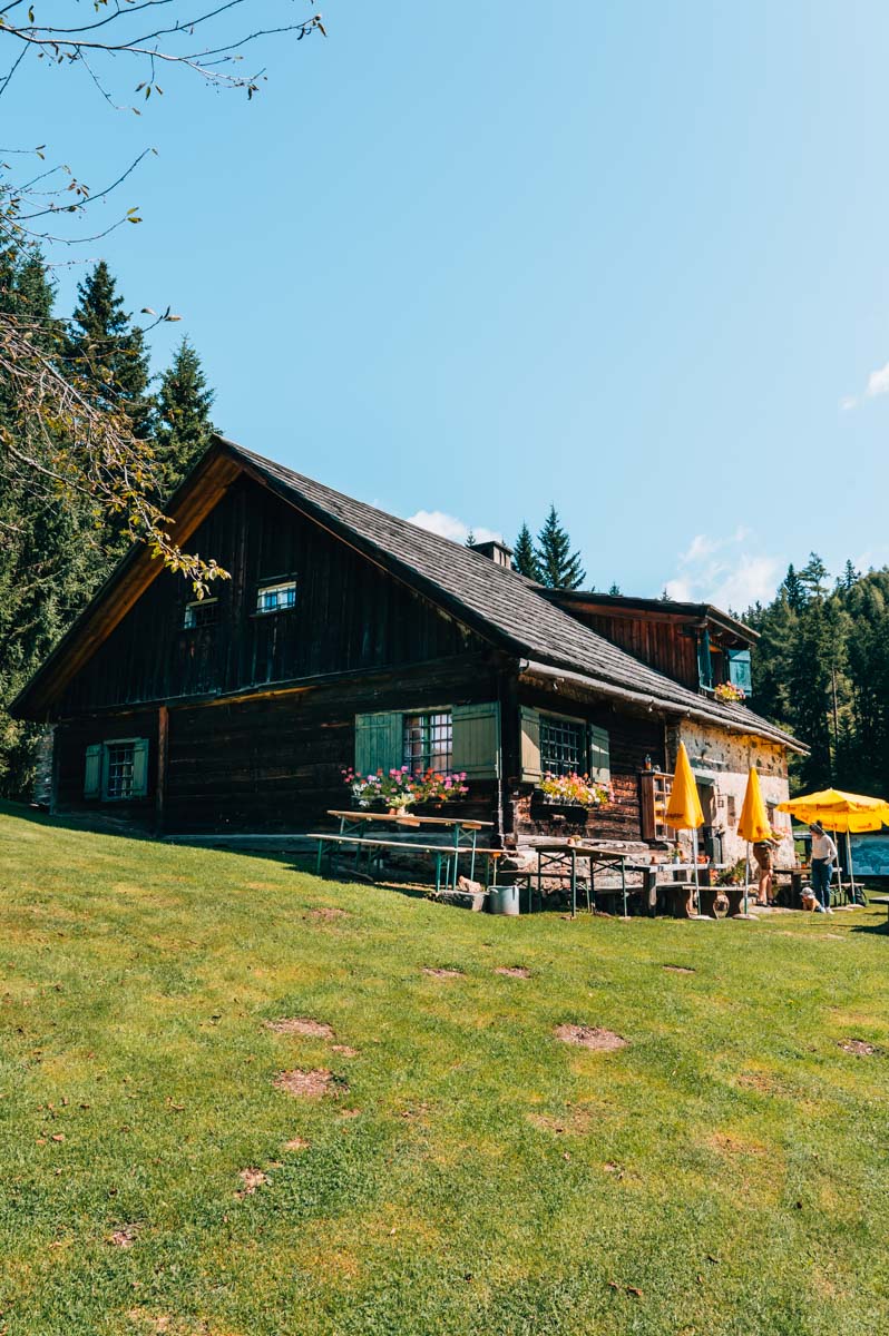 Für eine Einkehr nach der Seeumrundung empfehlen wir wärmstens das Gasthaus Karlhütte. Hier gibt’s traditionelle steirische Küche mit vielen vegetarischen und sogar veganen Optionen. Die Lage der Hütte mit dem Spielpatz und dem Blick in die Natur ist auch sehr nett.