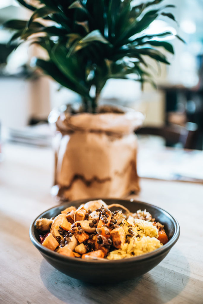 Du kannst aus belegten Broten, Salaten & Kuchen wählen. Außerdem gibt’s jede Menge Smoothies, frisch gepresste Säfte und verschiedene Nussmilch-Getränke. Wir waren zu Mittag hier, aber auch für ein gesundes Frühstück lohnt sich ein Besuch auf jeden Fall. Achja ein großes Plus: Der Kaffee ist hervorragend.