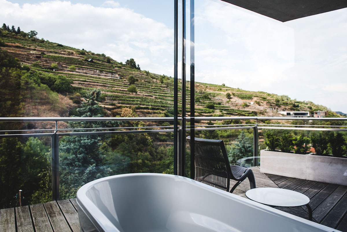 Ein besonderes Highlight des Hotels ist der Spa-Bereich mit Blick auf die Weinberge. Sehr zu empfehlen: Die neuen Ruheräume. Im Sommer gibt es auch einen Outdoor-Pool im Garten.