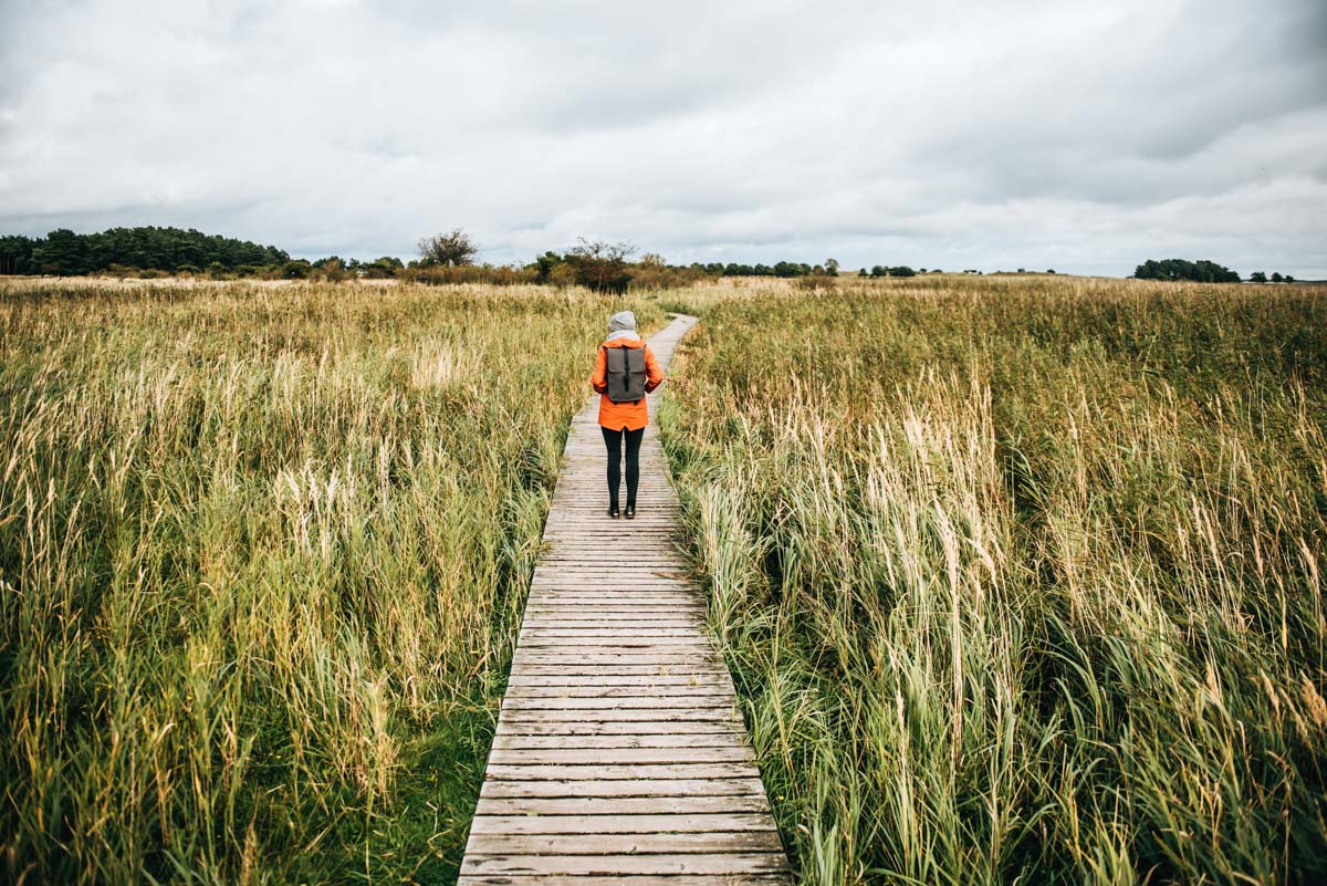 Direkt beim Darßer Leuchtturm startet ein einfacher Rundwanderweg, der auf 4 Kilometern einmal durch den Darßer Ort führt. „Ort“ ist übrigens eine irreführende Bezeichnung, denn du bist hier mutterseelenallein in der Natur. Der Weg verläuft zum Teil über Holzstege, zum Teil über Sandstrand quer durch die gigantische, raue Küstenlandschaft.