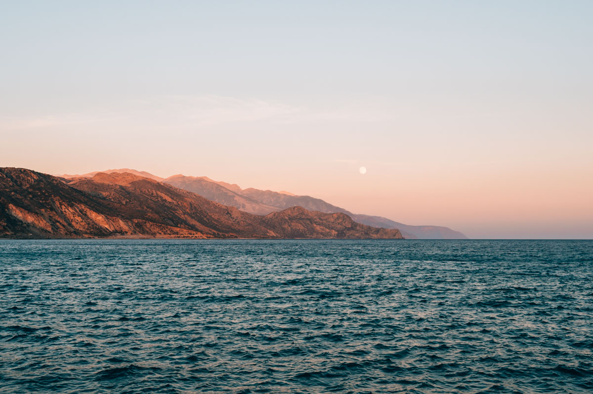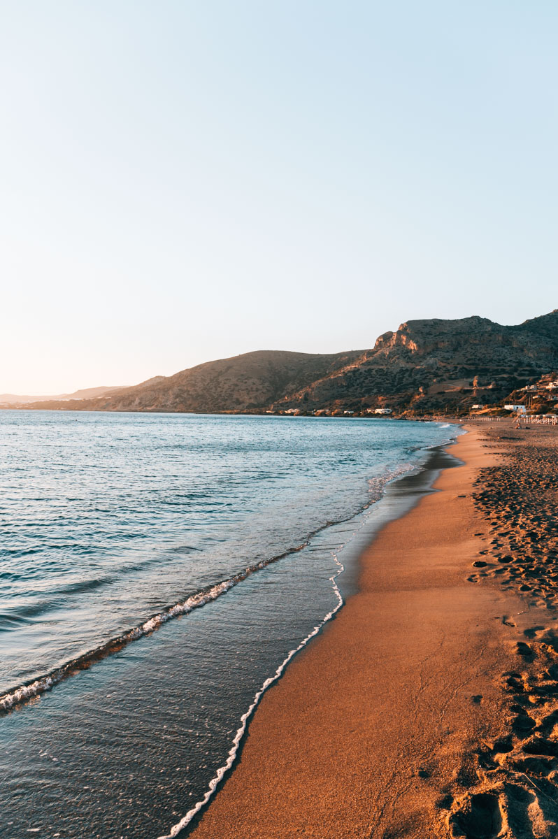 Der Hauptstrand von Paleochora ist der nach Westen gerichtete Pachia Ammos. Hier erwartet dich ein etwas dunklerer, sehr breiter Sandstrand. Die Kulisse mit den Bergen am Horizont ist wunderschön.