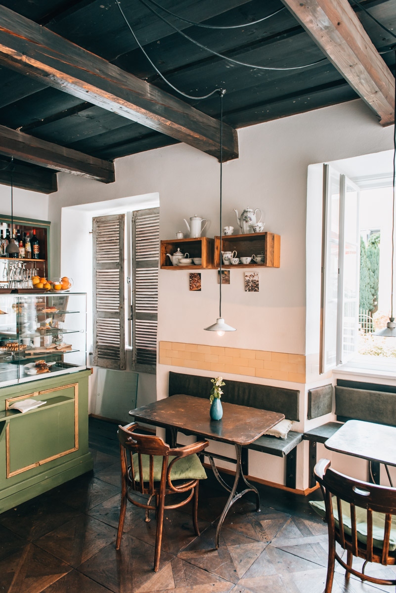 Der Mix aus alt und neu ist wirklich gelungen. Drinnen sitzt man unglaublich gemütlich. Das Ambiente hat uns ein wenig an unser geliebtes Altwiener Kaffeehausflair erinnert – mit hippem Einschlag allerdings. Draußen am Gehsteig gibt es auch ein paar Tische. Zwar direkt an der (schmalen) Straße, aber das stört überhaupt nicht weiter.