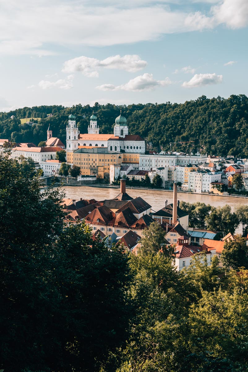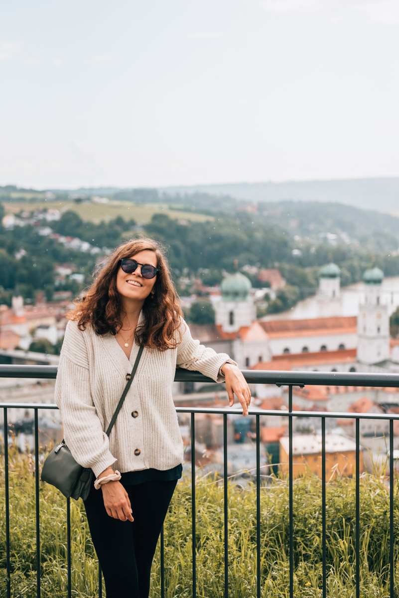 Von der Aussichtsterrasse genießt du einen herrlichen (wenngleich etwas verwachsenen) Blick aus der Vogelperspektive auf alle wichtigen Sehenswürdigkeiten in Passau inklusive Dom St. Stephan sowie Veste Oberhaus.