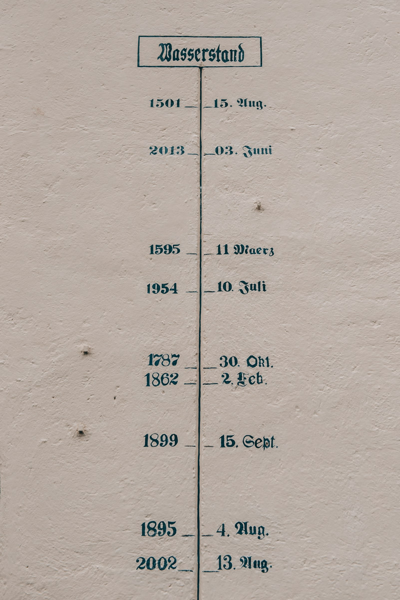 Leider kann der Turm nicht bestiegen werden. Dafür erklingt drei Mal täglich (um 10:30, 14:00 und 15:30 Uhr) das historische Glockenspiel am Rathausturm. Wahnsinnig eindrucksvoll fanden wir außerdem die Hochwassermarkierung am Turm. Es ist wirklich unvorstellbar, wie hoch der Wasserpegel hier schon lag.