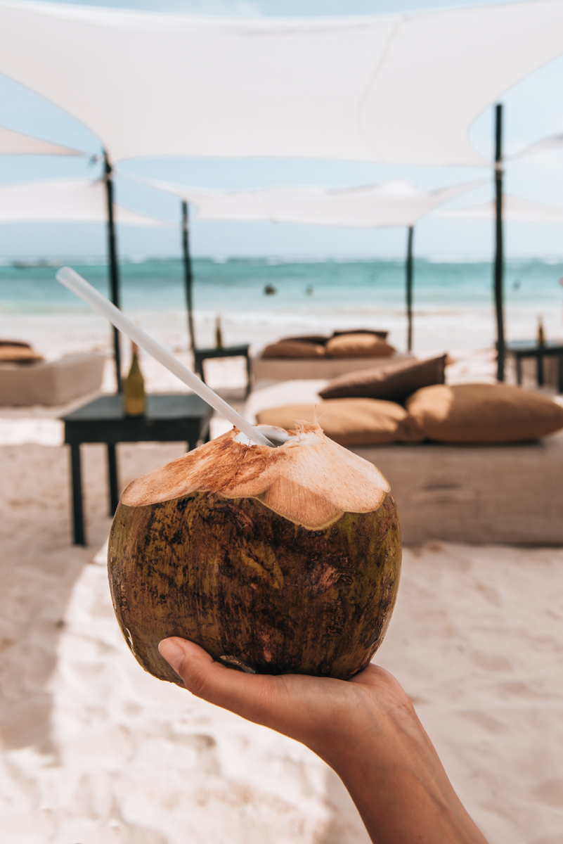 Wir haben unsere Zeit am Strand von Xpu-Há im KSM Beach Club verbracht. Die gewöhnlichen Liegen (nicht das Strandbett) sind kostenlos, man muss allerdings vor Ort etwas konsumieren. (Am besten vorab kurz checken, ob es einen Mindestbestellwert gibt – bei uns gab es keinen.) Wir haben uns einfach im Laufe des Tages immer wieder etwas bestellt (frische Kokosnuss, Cocktails, Nachos). Das hat für uns perfekt gepasst!