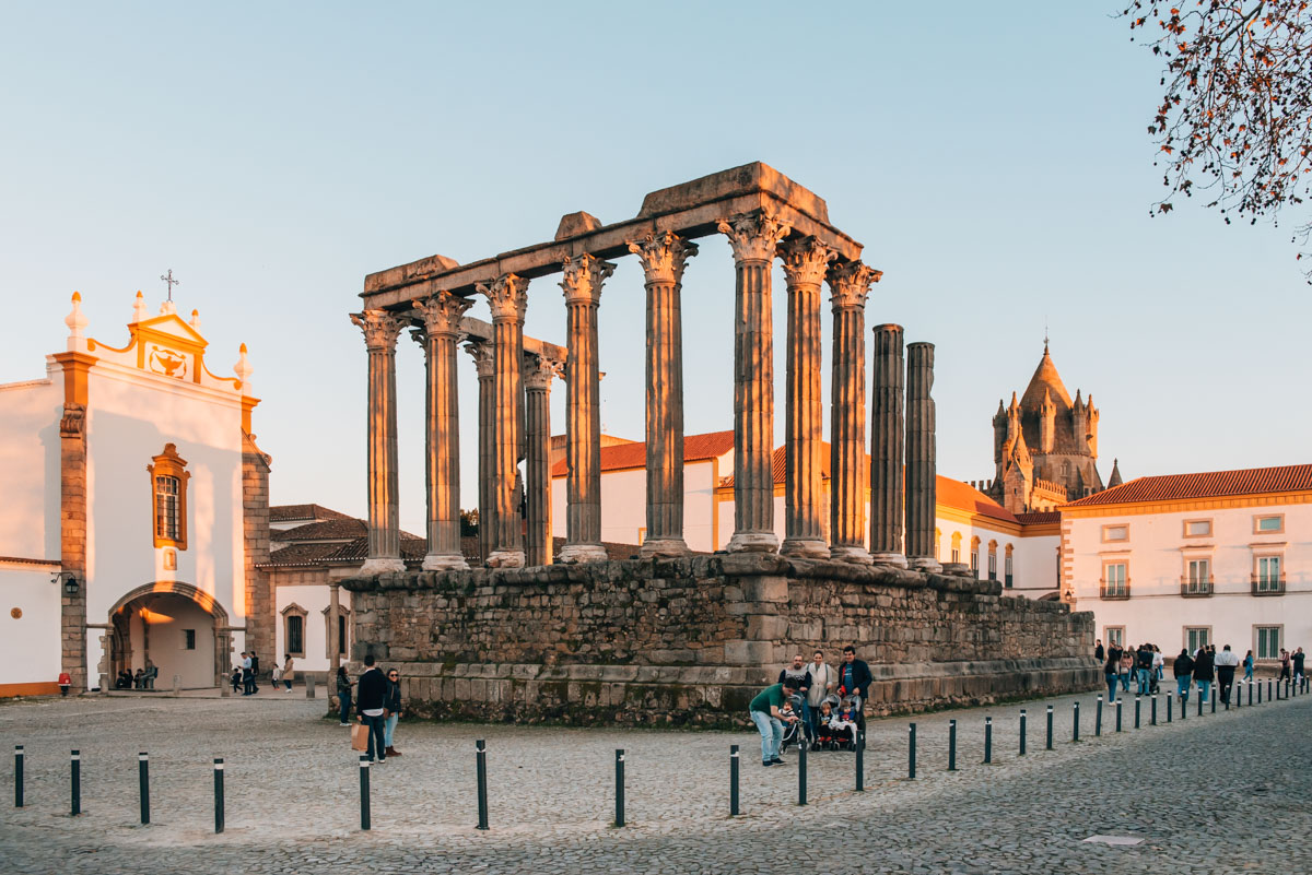 Für das ganz besondere Flair von Évora sorgt unter anderem der römische Tempel – eine der wichtigsten Sehenswürdigkeiten der Stadt. Direkt nebenan liegt die gigantische Kathedrale von Évora, Portugals größte Kathedrale. Man sollte Évora nicht verlassen, ohne die Kathedrale besichtigt zu haben. Der gotische Kreuzgang ist eindrucksvoll und das Ambiente am Dach der Kathedrale einmalig.