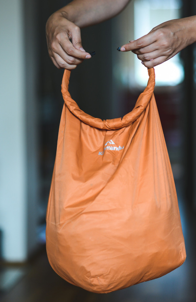 Unser Modell ist von Kathmandu – jener Outdoormarke, der wir seit unserer ersten Neuseeland-Reise hoffnungslos verfallen sind. Der Vorteil: Er ist – verglichen mit anderen Drybags – viel platzsparender und lässt sich ganz klein zusammenrollen.