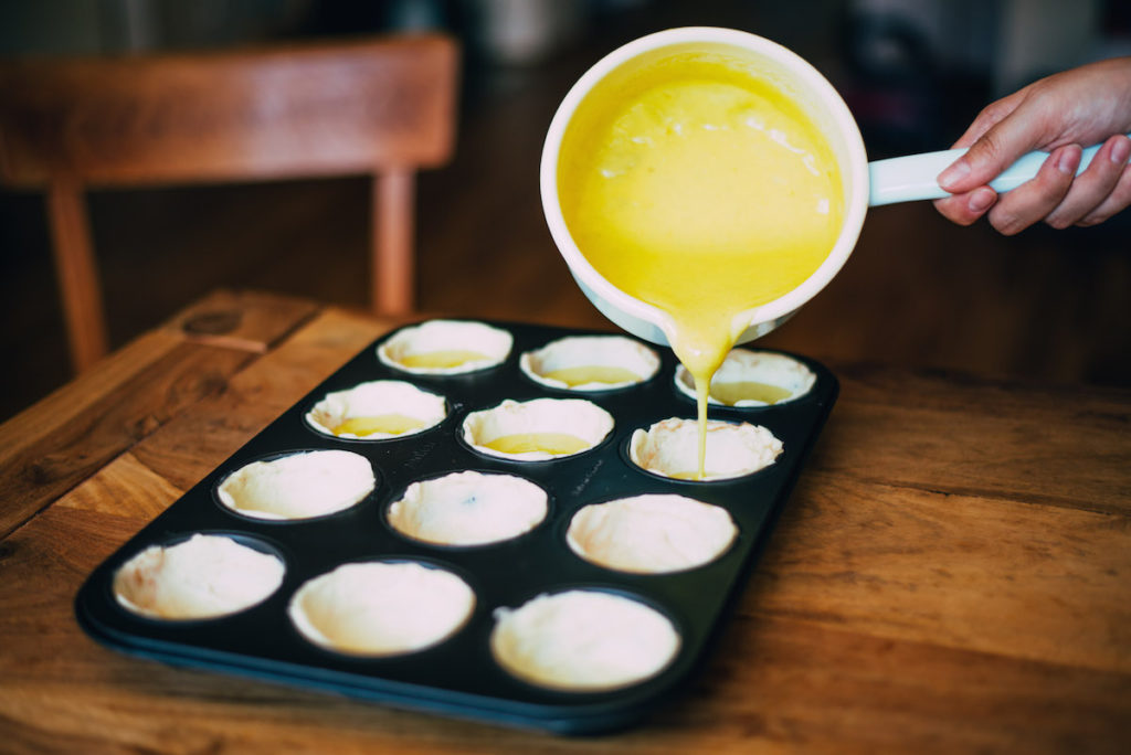 Dann die abgekühlte Creme gleichmäßig einfüllen – am besten bis ca. 1cm unter den Rand, da sie beim Backen noch etwas aufgeht.