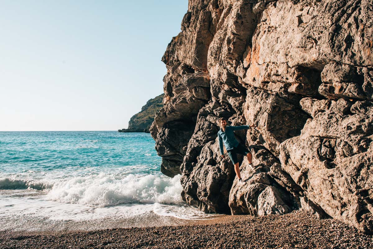 Ca. 15 Minuten dauert der Fußweg, der über Schotter und Steine führt, aber mit Flip Flops prinzipiell auch machbar ist. Unten angekommen, kannst du es dir auf den Felsen bequem machen und ins kristallklare, ziemlich ruhige Wasser springen.