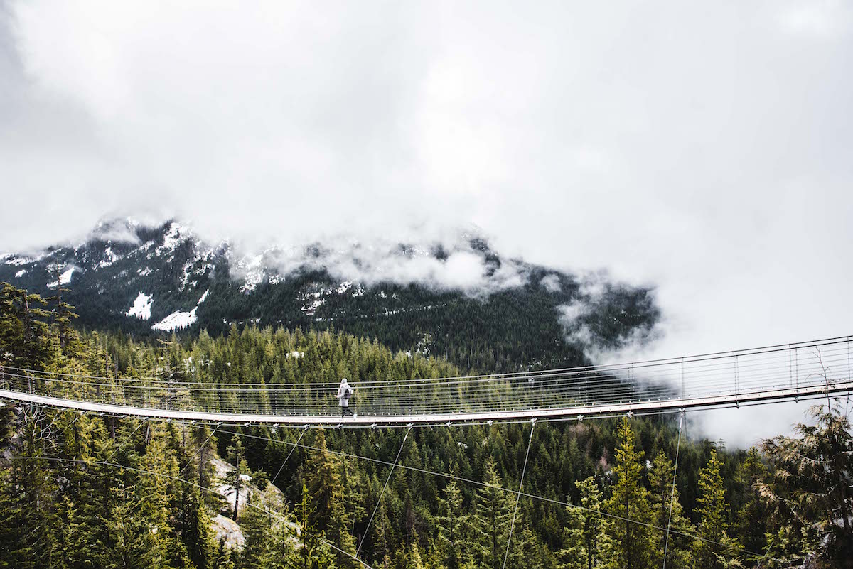 Mit der Sea to Sky Gondola durchbrechen wir die hartnäckige Nebeldecke. Am Gipfel angekommen genießt man an schönen Tagen eine beeindruckende Fernsicht auf das Bergpanorama von British Columbia. Wir müssen bei unserem Besuch leider ein bisschen unsere Fantasie spielen lassen, denn die Berggipfel blitzen nur ab und zu aus dem Nebel hervor. Zum Glück ist die Fernsicht nicht der einzige Grund für unseren Besuch: die Hängebrücke am Berggipfel steht ihrer kleinen Schwester in Vancouver um nichts nach.