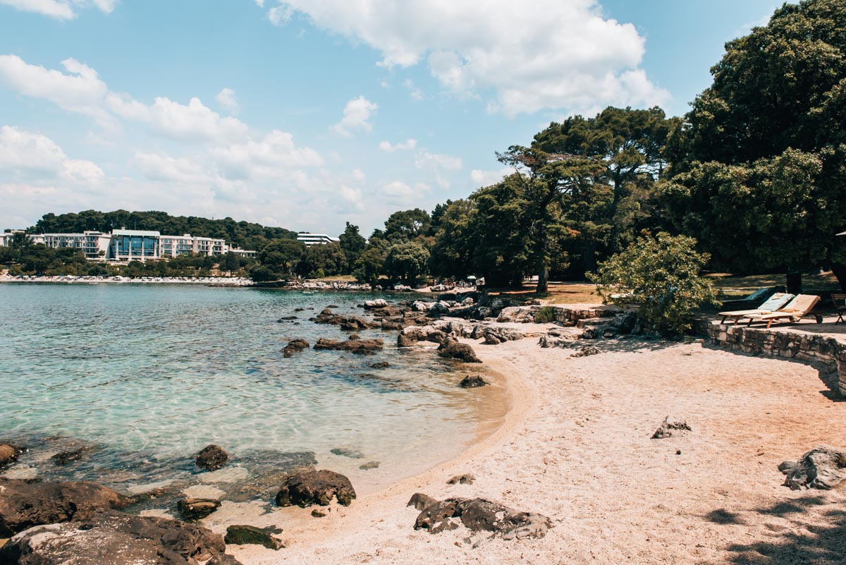 Südlich vom Ortszentrum Rovinjs befindet sich eine bewaldete Halbinsel, der sogenannte Waldpark Zlatni Rt, auch bekannt als „Punta Corrente“. In diesem autofreien Naturschutzgebiet liegen viele der schönsten Strände rund um Rovinj, darunter auch die folgenden beiden: