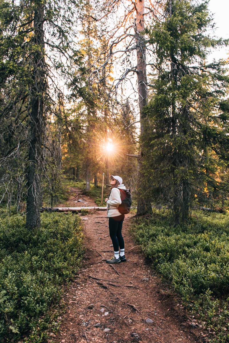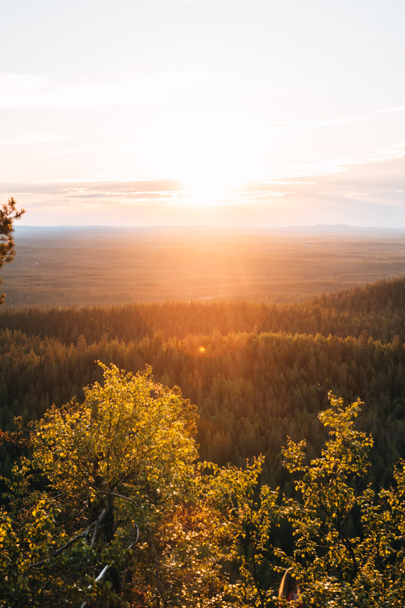Gesucht: Eine einfache, aussichtsreiche Wanderung. Gefunden: Der kurze Anstieg auf den Hügel namens Konttainen. Er befindet sich etwa 10 Autominuten nördlich von Ruka und ist der perfekte Platz, um die Mitternachtssonne zu bestaunen.