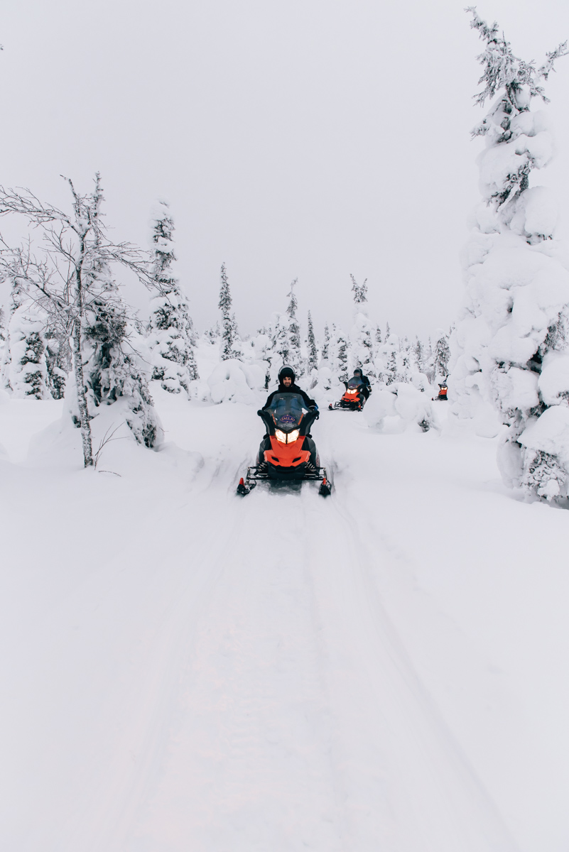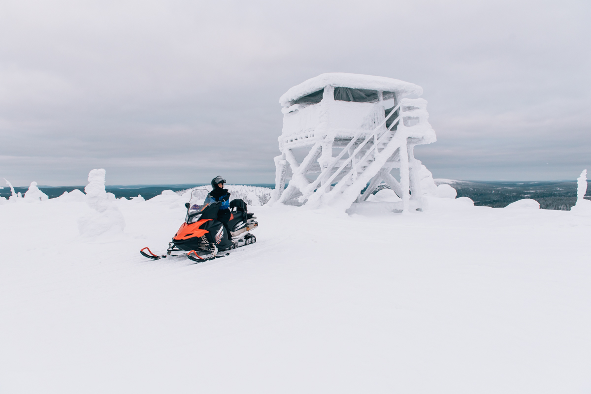 Eine gute Möglichkeit, den Ruuhitunturi zu erkunden, ist eine Tour mit dem Schneemobil. Die Fahrt startet direkt in unserer Unterkunft Sallatunturin Tuvat. Dort kannst du dir zunächst einmal (wenn du möchtest) einen Thermoanzug leihen.