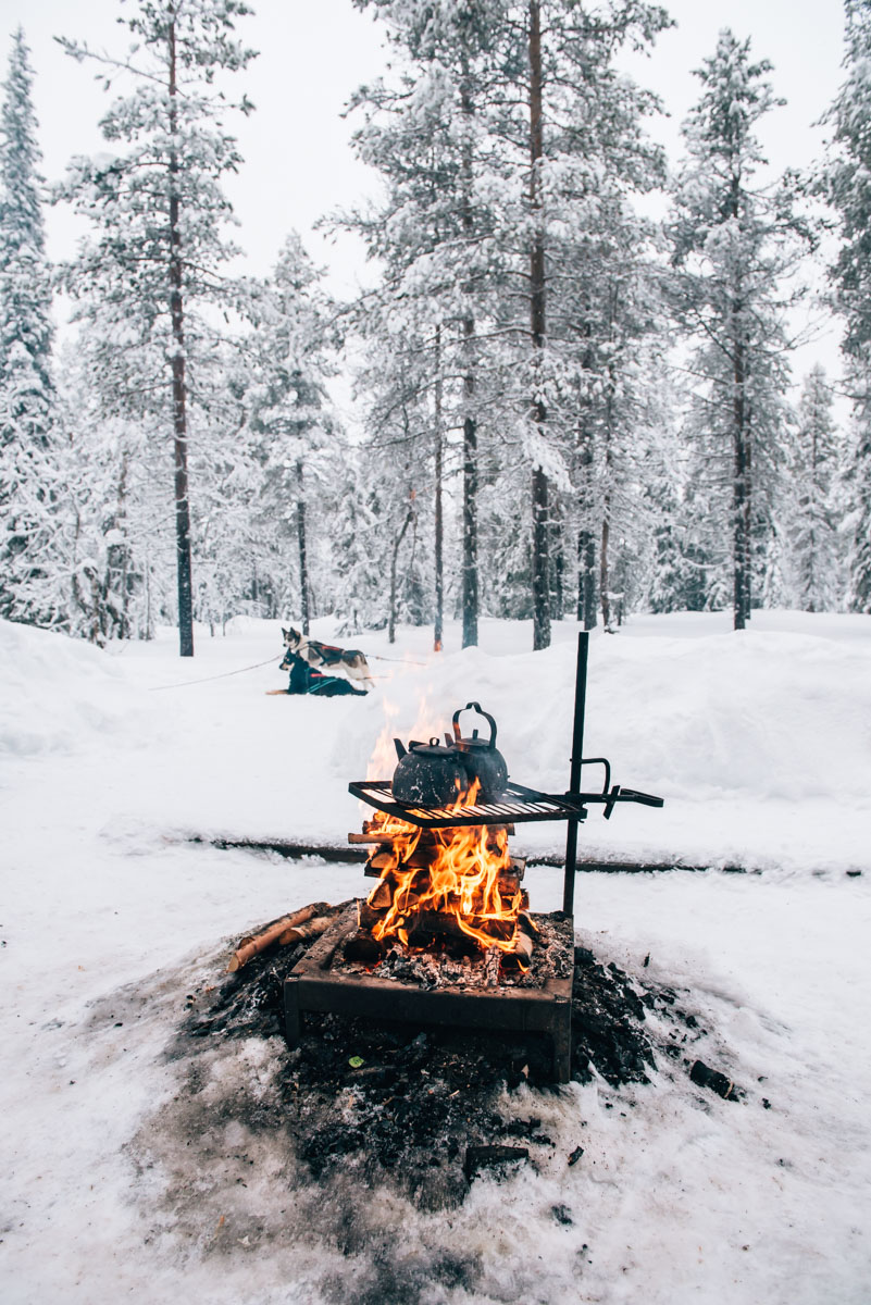 Bei unserer 2-stündigen Tour war auf halber Strecke eine Pause eingeplant. Während sich die Huskys erholen konnten (inklusive Streicheleinheiten, versteht sich), gab’s für uns ein Lagerfeuer mitten im Nirgendwo.