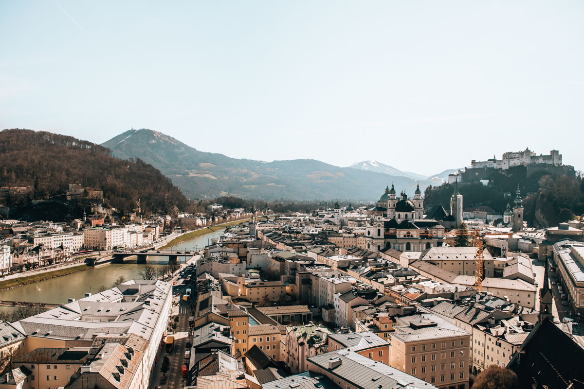 Einen der bekanntesten Ausblicke auf Salzburg hast du vom Kapuzinerberg, der sich (von der Festung gesehen) auf der gegenüberliegenden Seite der Salzach befindet. Wir empfehlen dir auf jeden Fall, zum Sonnenuntergang zu kommen.